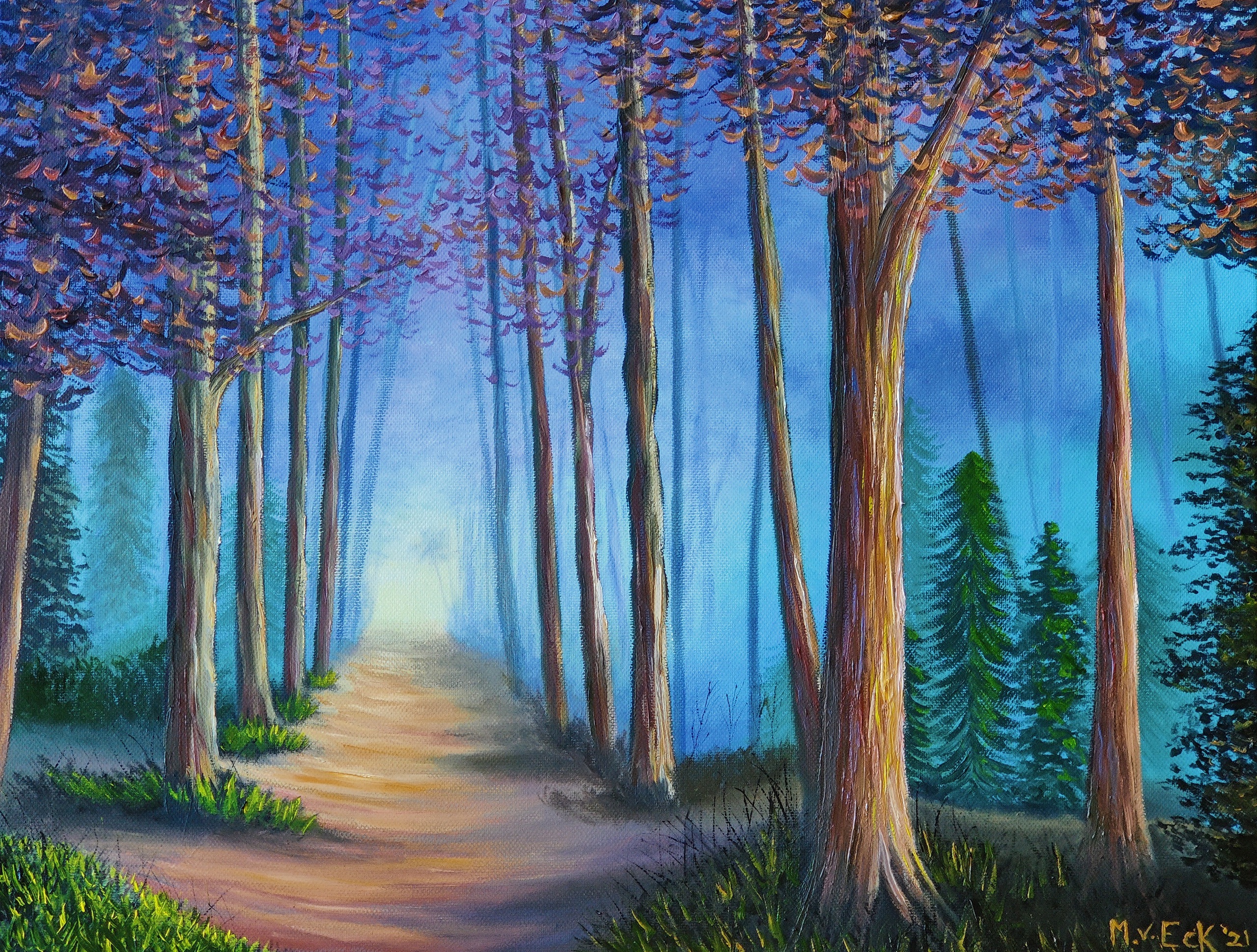 Misty Forest Trail, olieverf op doek, Merel van Eck 2021. Dit schilderij is gebaseerd op een tutorial van Kevin Hill.
