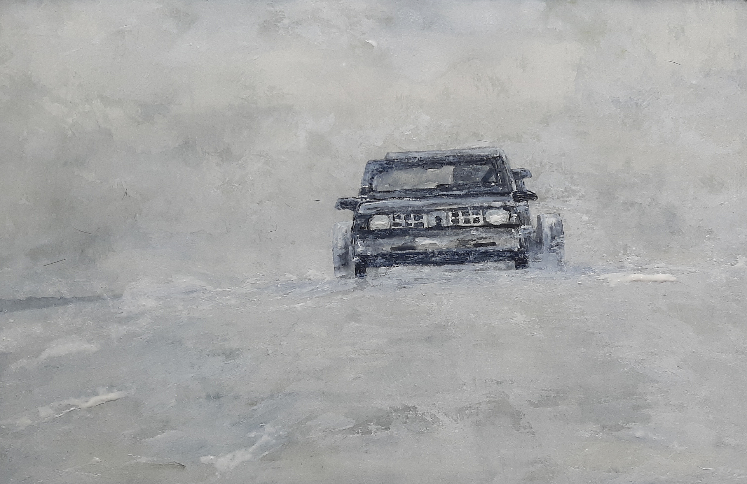 FARGO. Ik verwijs bij deze titel naar de legendarische Amerikaanse misdaadfilm van de broers Joel en Ethan Coen. De film verscheen in 1996, en de hoofdrollen werden o.a. vertolkt door Francis McDormand, William H. Macy en Steve Buscemi. De film werd overladen met Oscarnominaties en diverse andere filmprijzen. Later kwam er een vervolg in de vorm van een tv-serie. Het begin van de film heeft me altijd geïntrigeerd: een auto die zich in een compleet winters landschap door een sneeuwstorm ploegt. Locatie: de omgeving van het stadje Fargo, in North Dakota. Het aquarel is gemaakt op 300grams Hahnemühle - Cézanne papier. De vermelde prijs is exclusief passe-partout en/of lijst