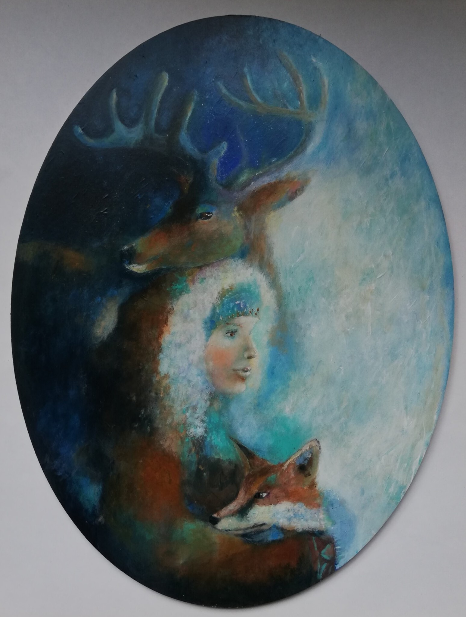 Sjamanen meisje met hert en vos, hoort ovalen witte lijst bij