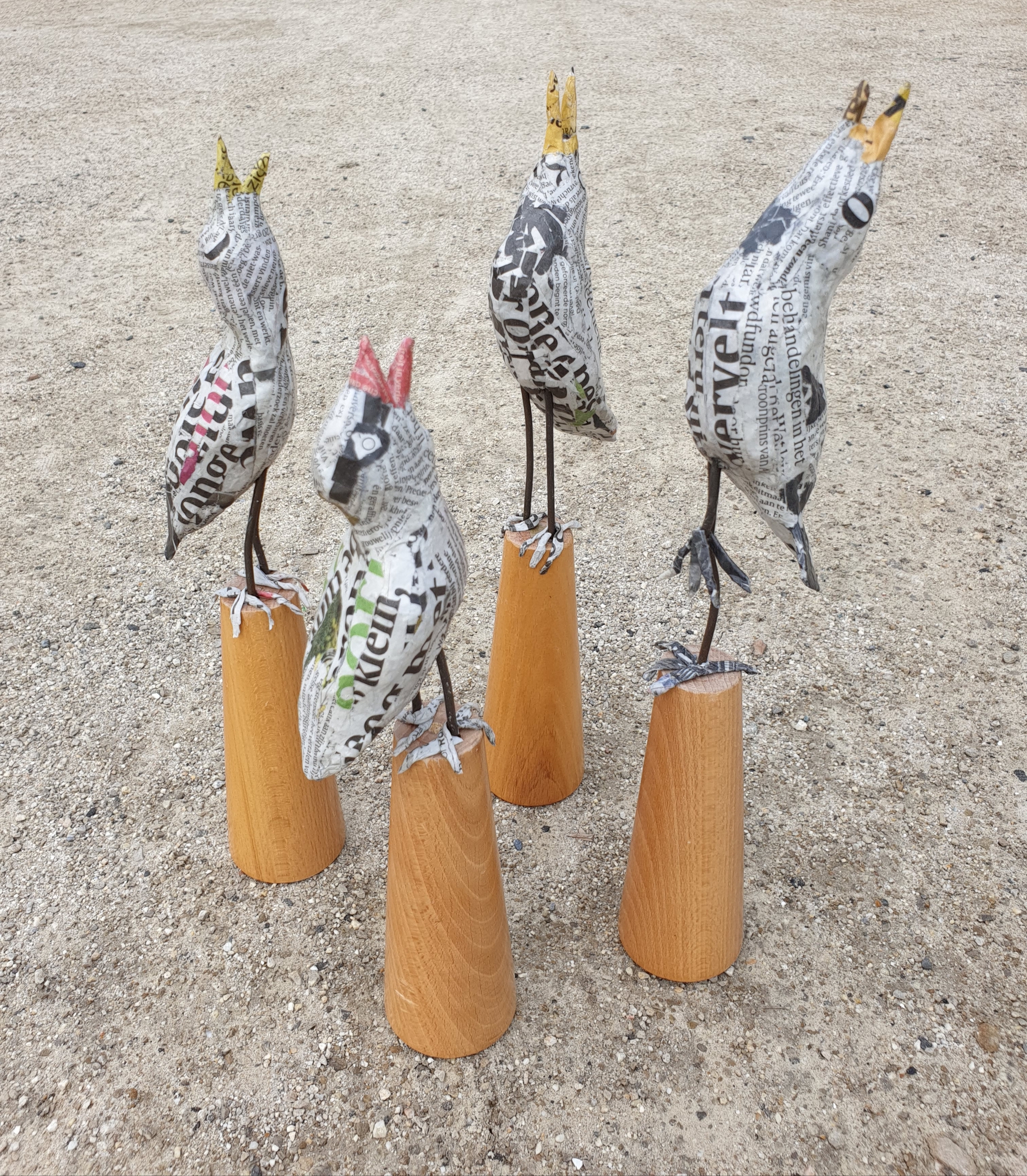 Vier vogels van krantenpapier, met poten van zachtgegloeid staaldraad. Sokkels zijn oude stoelpoten. Geen verf gebruikt, alleen beeldmateriaal uit de krant.
