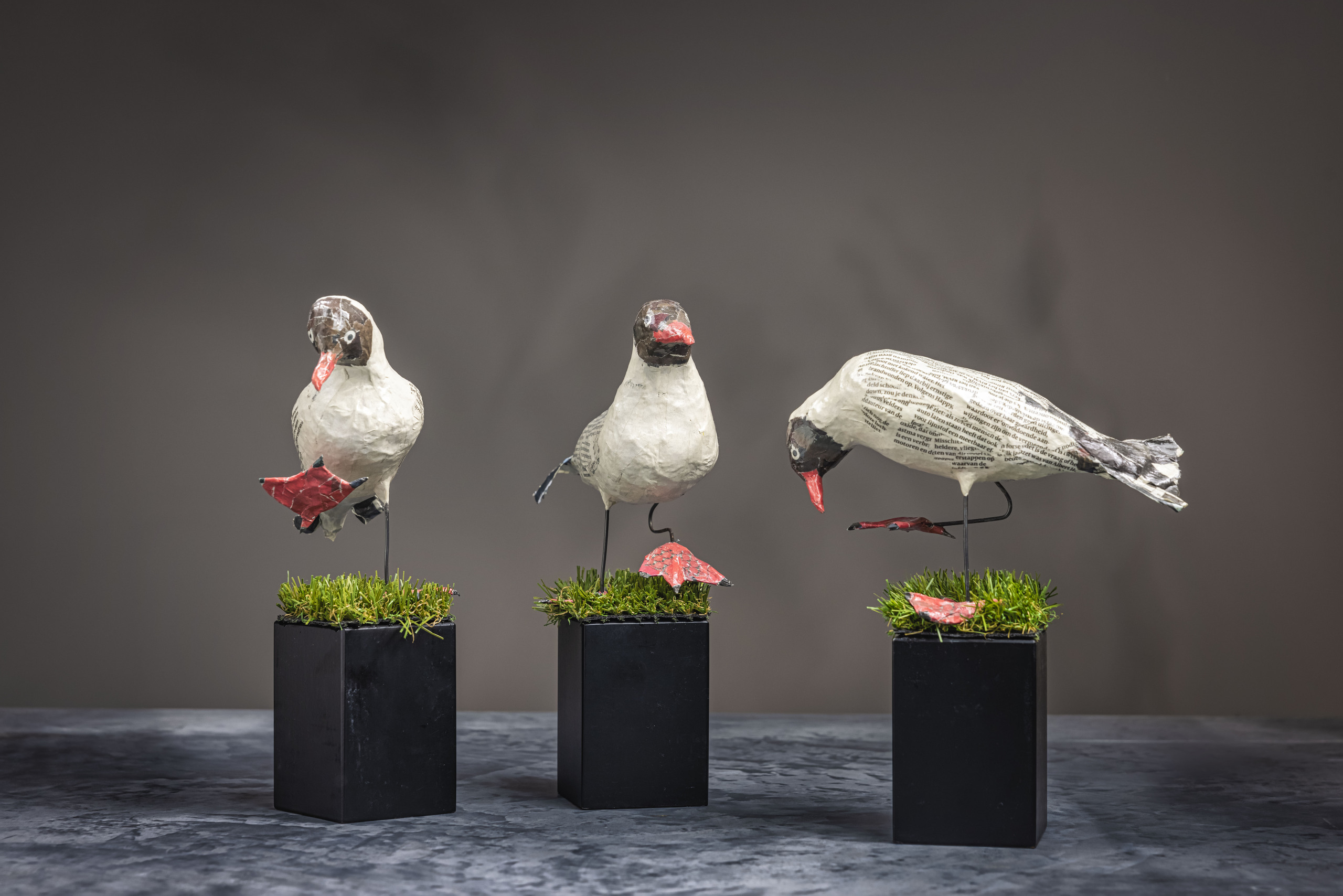 Drie meeuwen van krantenpapier met poten van zachtgegloeid staaldraad op houten sokkels bedekt met kunstgras. Ze hebben trappelende poten, alsof ze wormen in het gras zoeken. Geen verf gebruikt. De sokkels zijn gebruikte bedpoten.