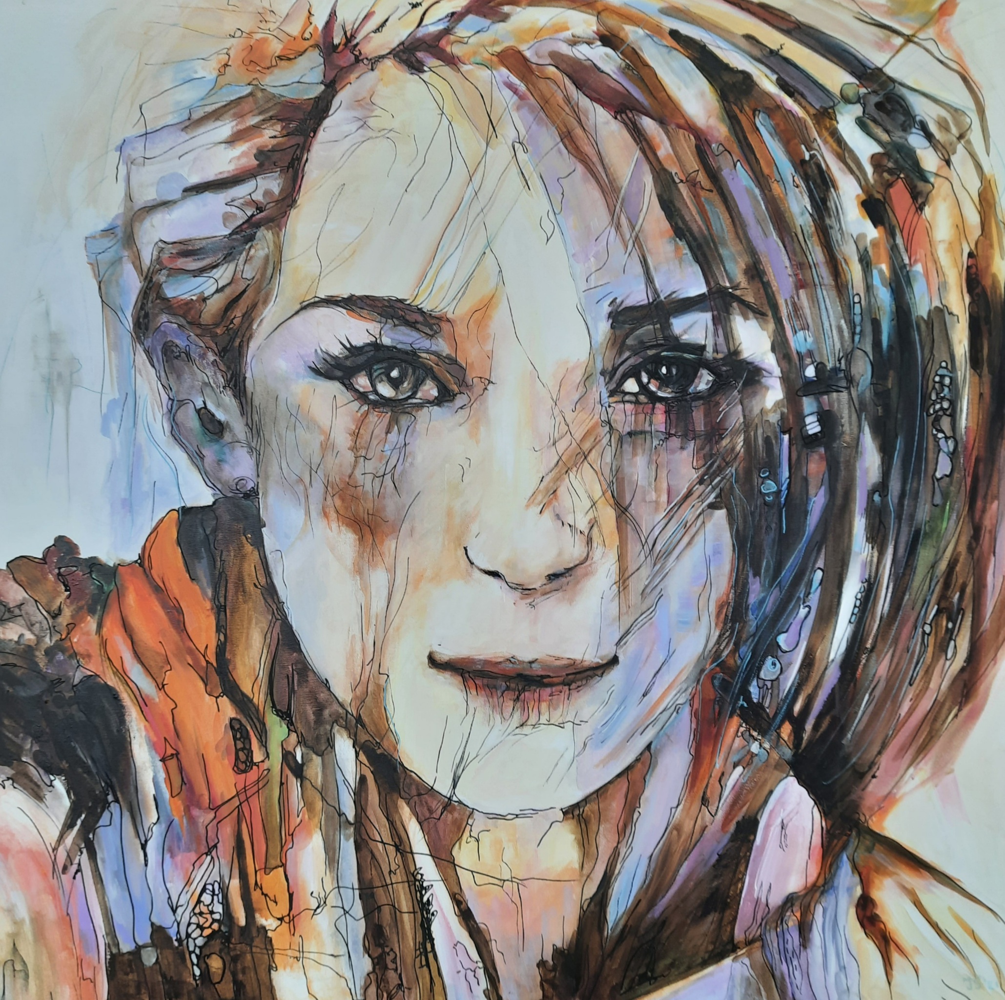 Gezicht bewerkt in deepdream , en in acryl vrij vertaald met lijnen..
