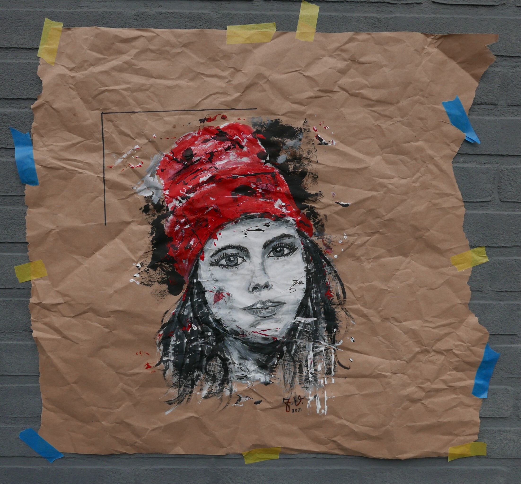 portret van een meisje in zwart wit met rode beanie. moderne schilderstijl.