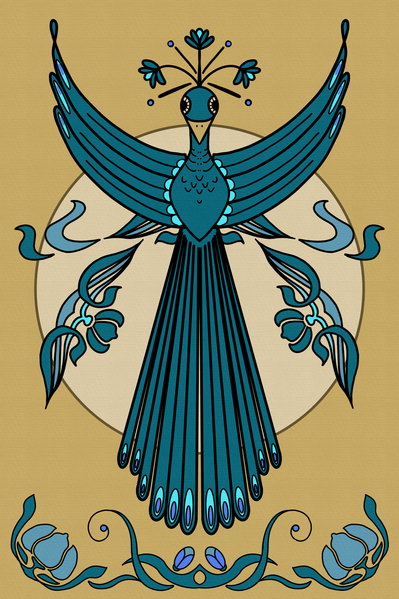 Print van deze vliegende pauw in elk formaat via https://www.werkaandemuur.nl/nl/shopwerk/Jugendstil-vliegende-pauw/780952/132