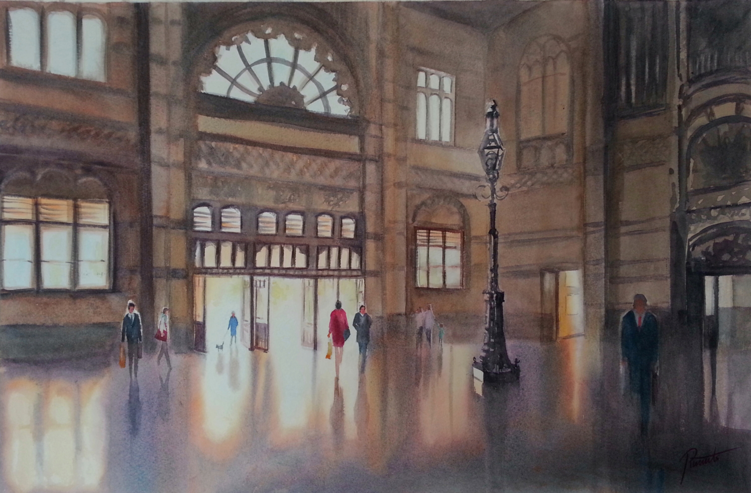 de monumentale stationshal in Groningen badend in het zonlicht in passe-partout van 50x70 cm.