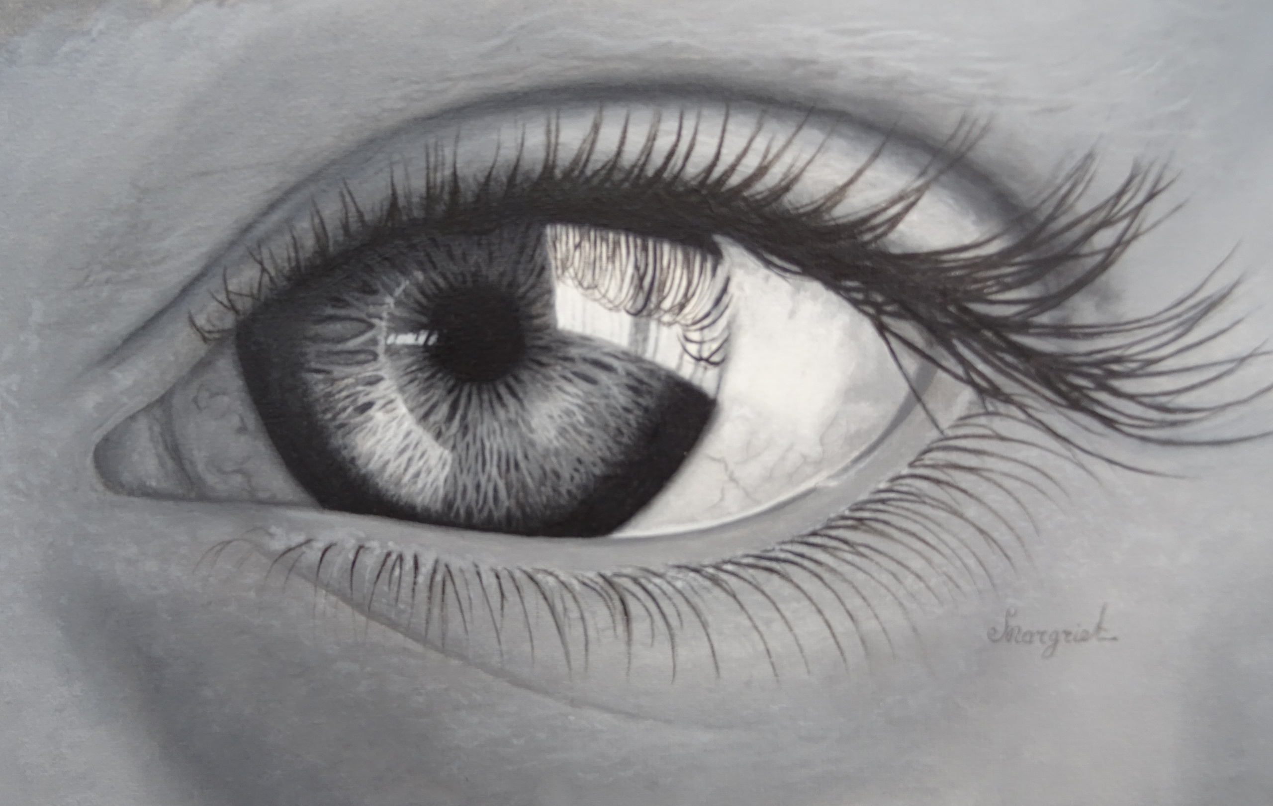 Oog Eye Realisme Realistisch Hyperrealisme Hyperrealistisch Reflectie Realistic Reflection Oil Oilpanting Painting Olieverf Olieverfschilderij Zwart Wit Margriet De Bie Van Mourik Biezonder Boek Boekje Schilderles
