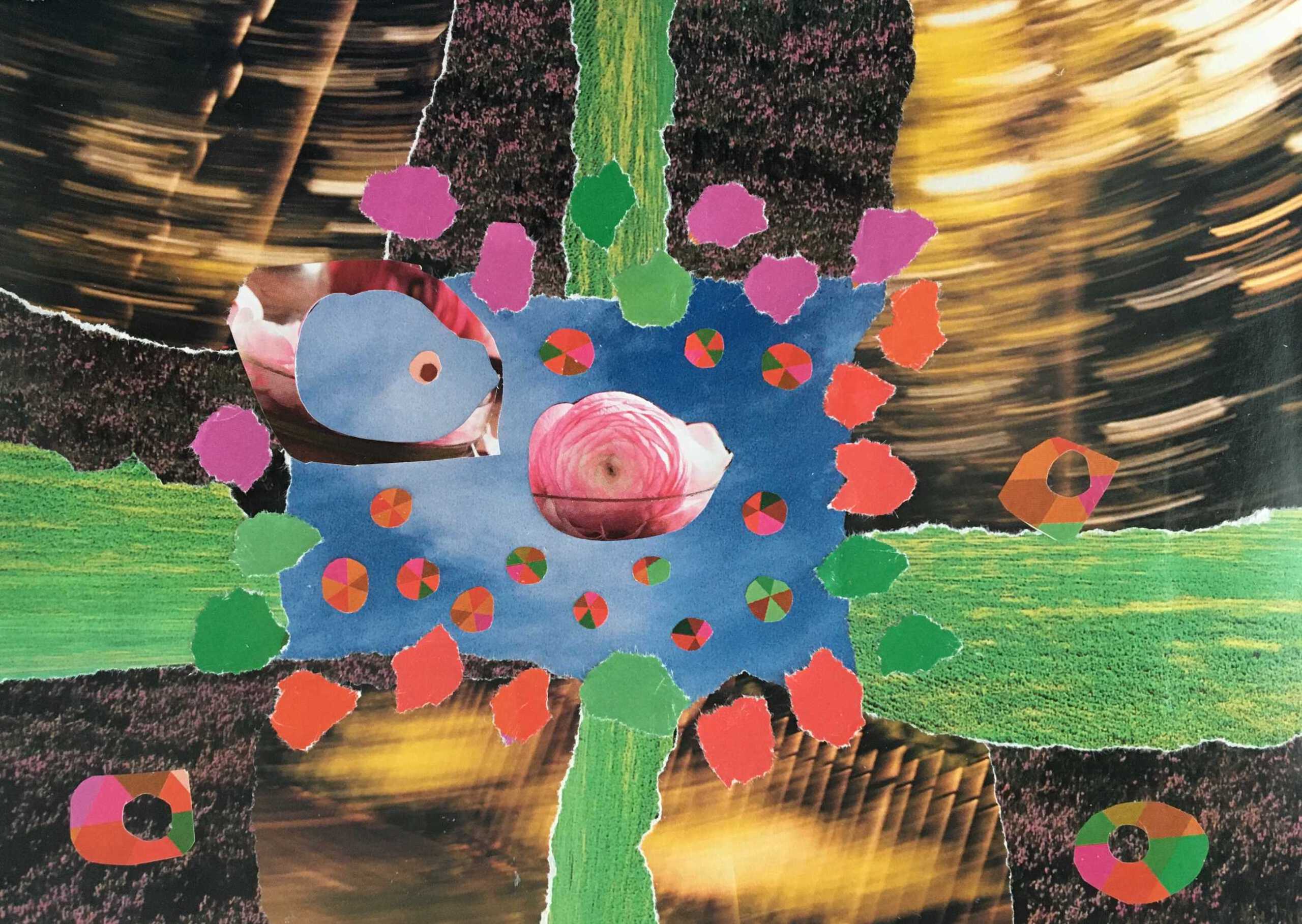 Groen Blauw Roze Roos Beweging Licht Heide Stippen Collage Papier Verhalend Surreeel Papierkunst Lijm Schaar Spiritueel Collagecoaching Coach Interpreteren Vertalen Papierkunstenaar Intuïtief Flow Kleurig Bewegend