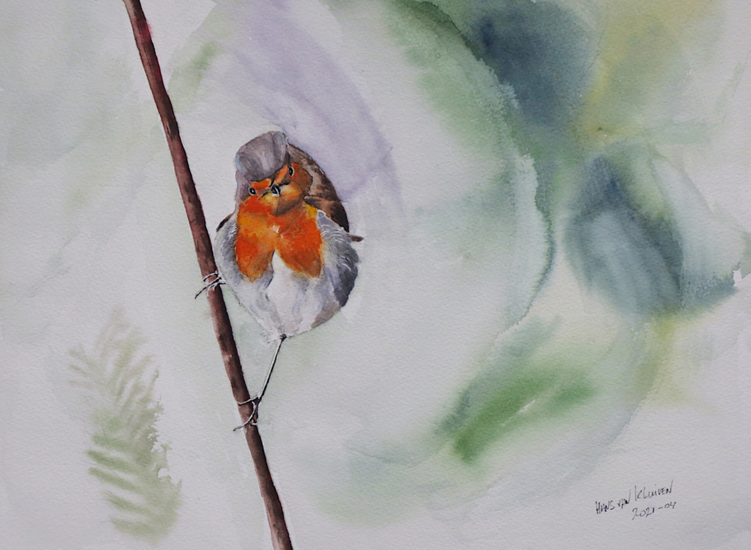 aquarel van een Roodborstje,1 van een serie van 4 soorten vogeltjes die veel in mijn buurt voorkomen.
