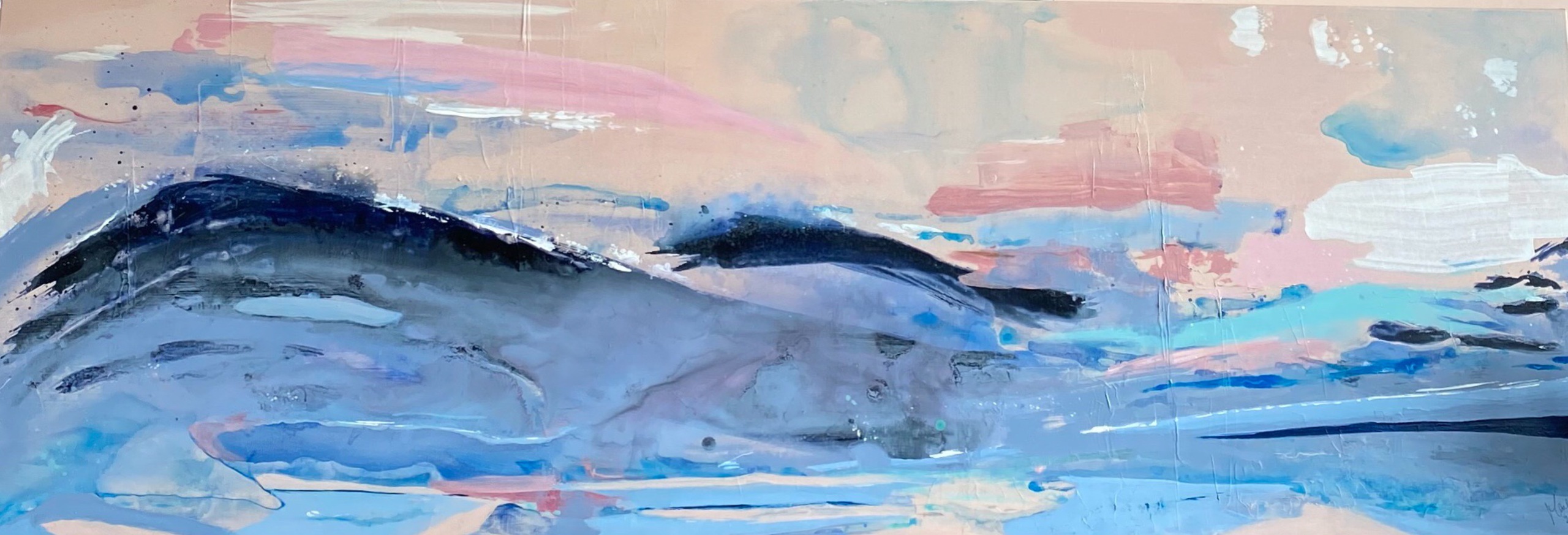 Dit is een groot werk, 150cm breed en 50 cm hoog, op een 3D doek. Zee, golven, lucht, natuurlijk veel blauw, maar ook veel beweging. Ik had vooral zin in beweging. Gedurende het schilderen luisterde ik veel naar The Sea van Haevn, daar komt uiteindelijk ook de titel vandaan.