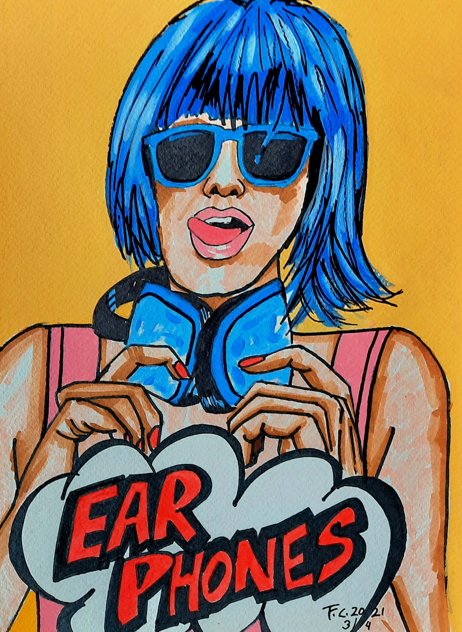 Vrouw Mixed Media Jonge Girl Popart Koptelefoon Earphones Portret