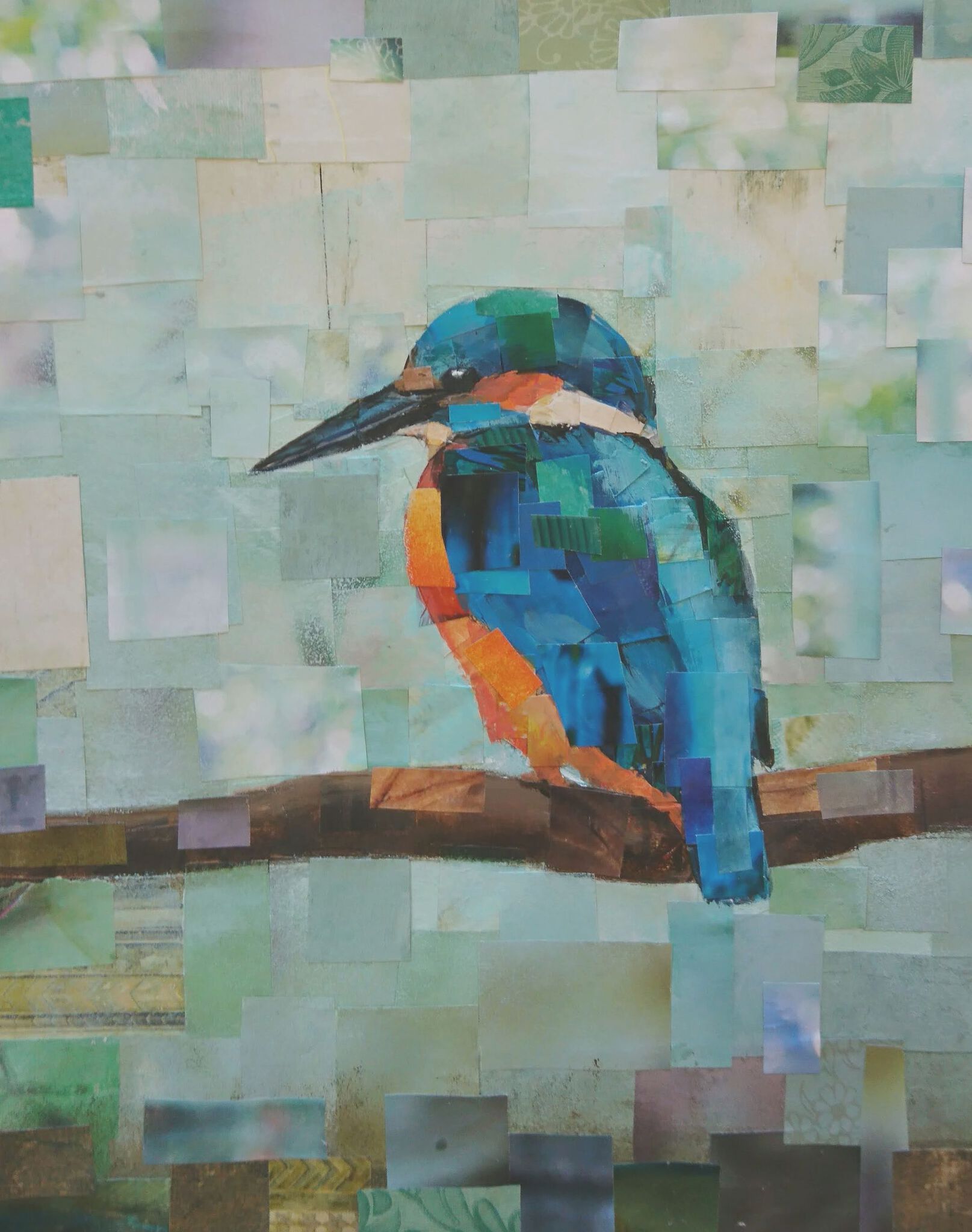 Collage van tijdschriftpapier en acrylverf op papier van een ijsvogeltje op een tak.