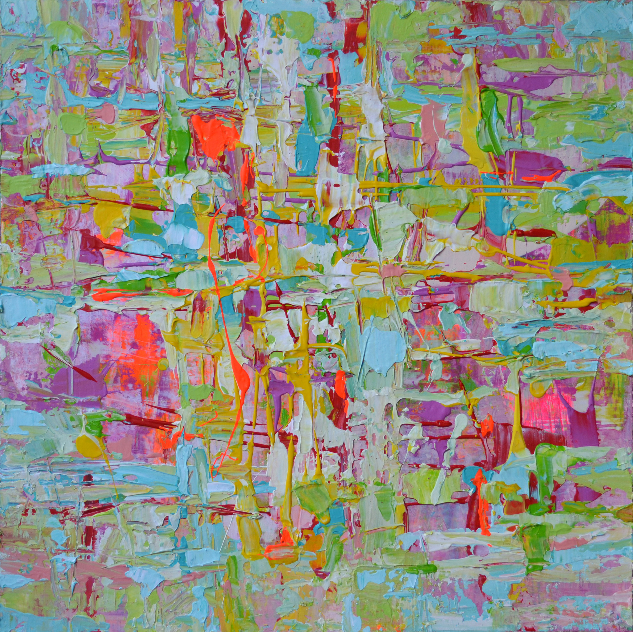 A spontaneous and heavy-textured composition of pastel and primary colours. Blue, the most calming colour, is most likely to give you peace, stability and guidance to hope. The primary colour, yellow produces a warming effect and arouses happiness. The soft green colour, which comes from yellow and blue combined, is essential to adding harmony. Soft pink and purples are enhancing happiness, hope and harmony ultimately leads to more blissful living.