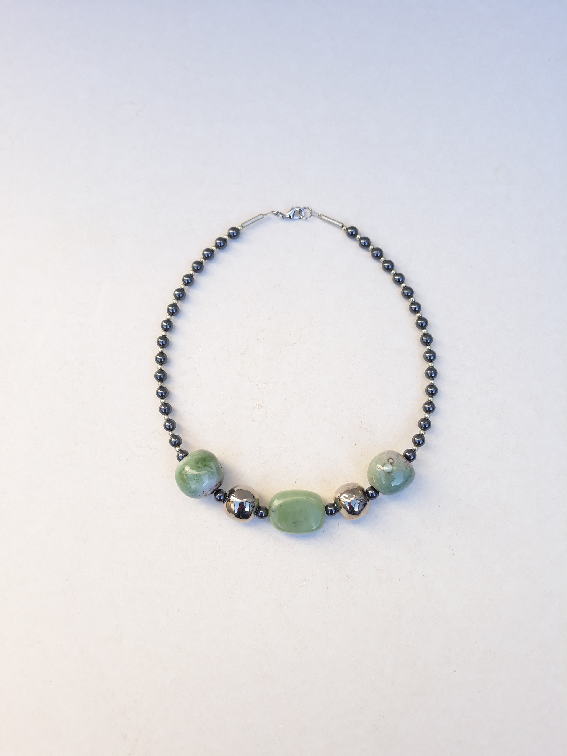 Ketting met steengoed en porseleinen kralen gecombineerd met half-edelsteen, waaronder hematiet. Kralen met groen glazuur en platina luster.