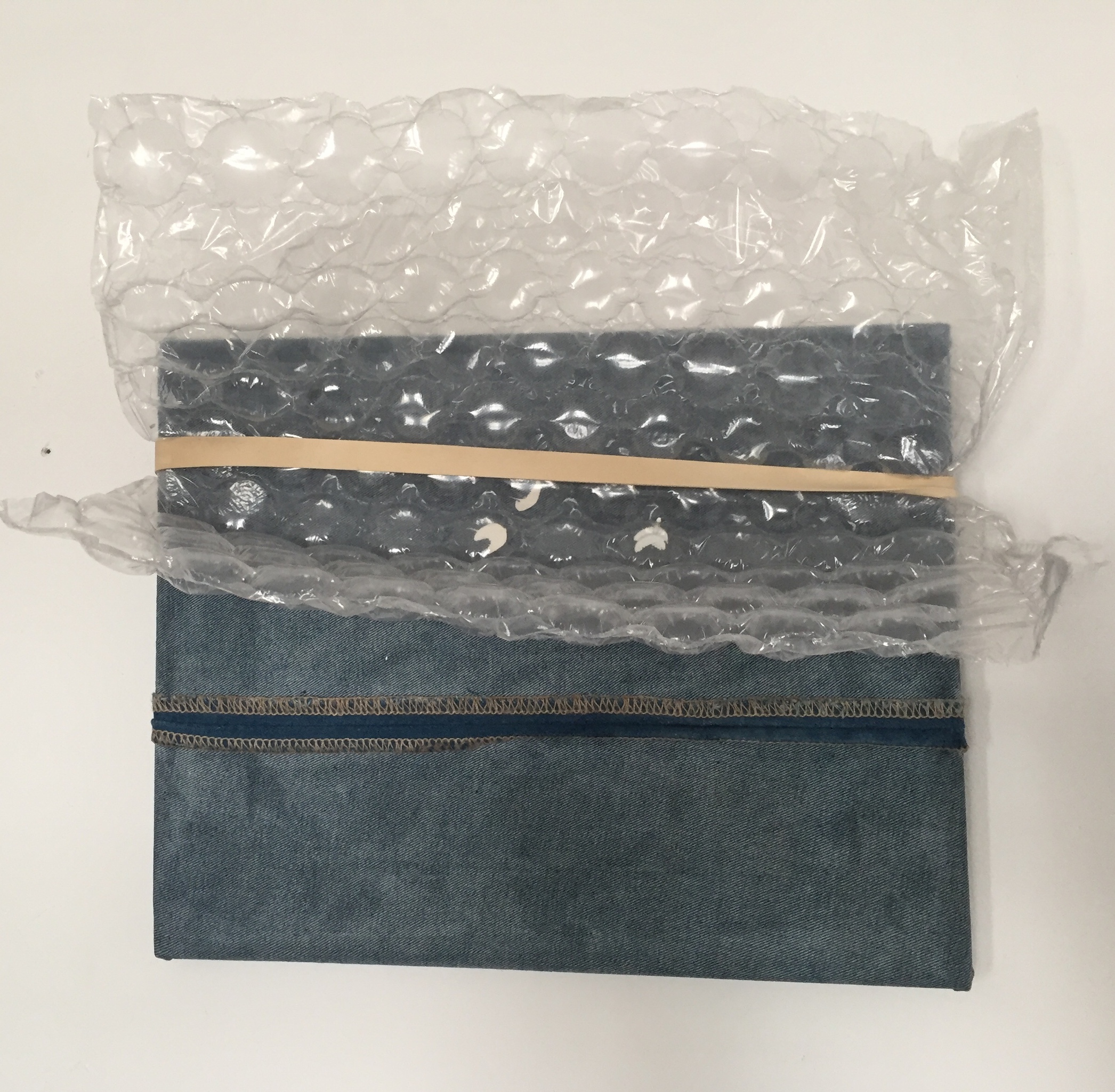 Collage / Elastiek Décollage Jeans-canvas Recycling/ Rubberband Bubbeltjesplastic