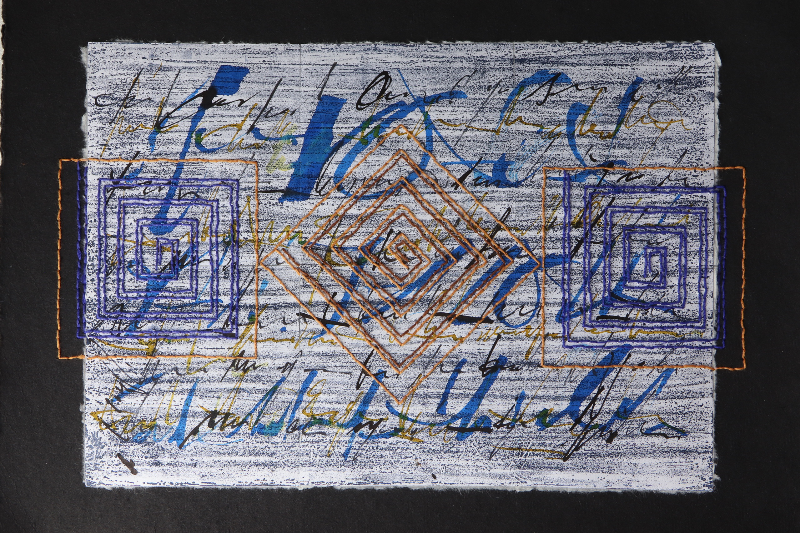 Abstracte ets, abstracte kalligrafie met sashiko figuren geborduurd. Sashiko borduurgaren en blauw en bruin. Acrylinkt blauw rn bruin. Geborduurd op zwarte achtergrond van handgeschept papier.