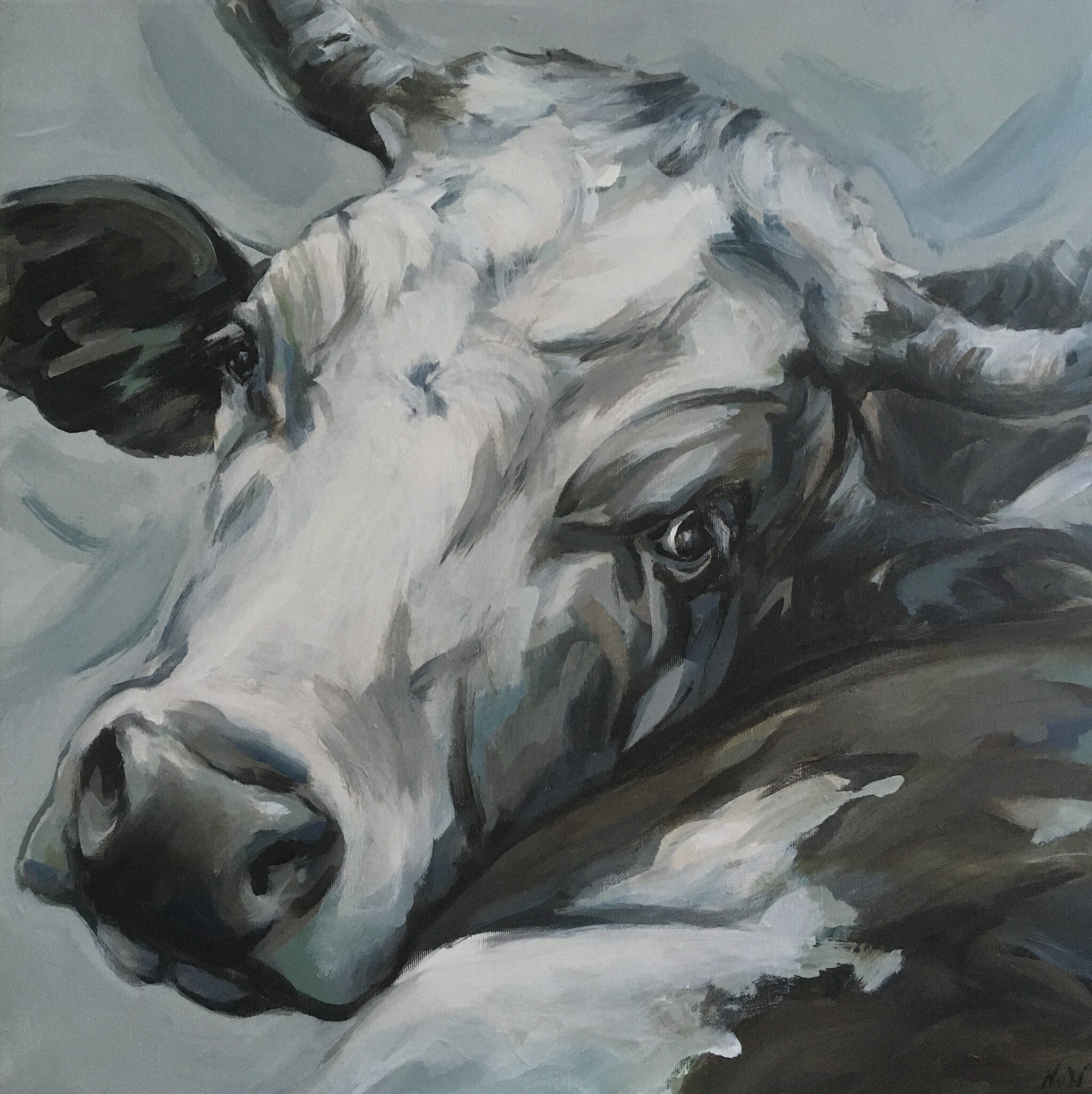 Nelleke schildert voornamelijk koeienschilderijen met een vlotte streek.