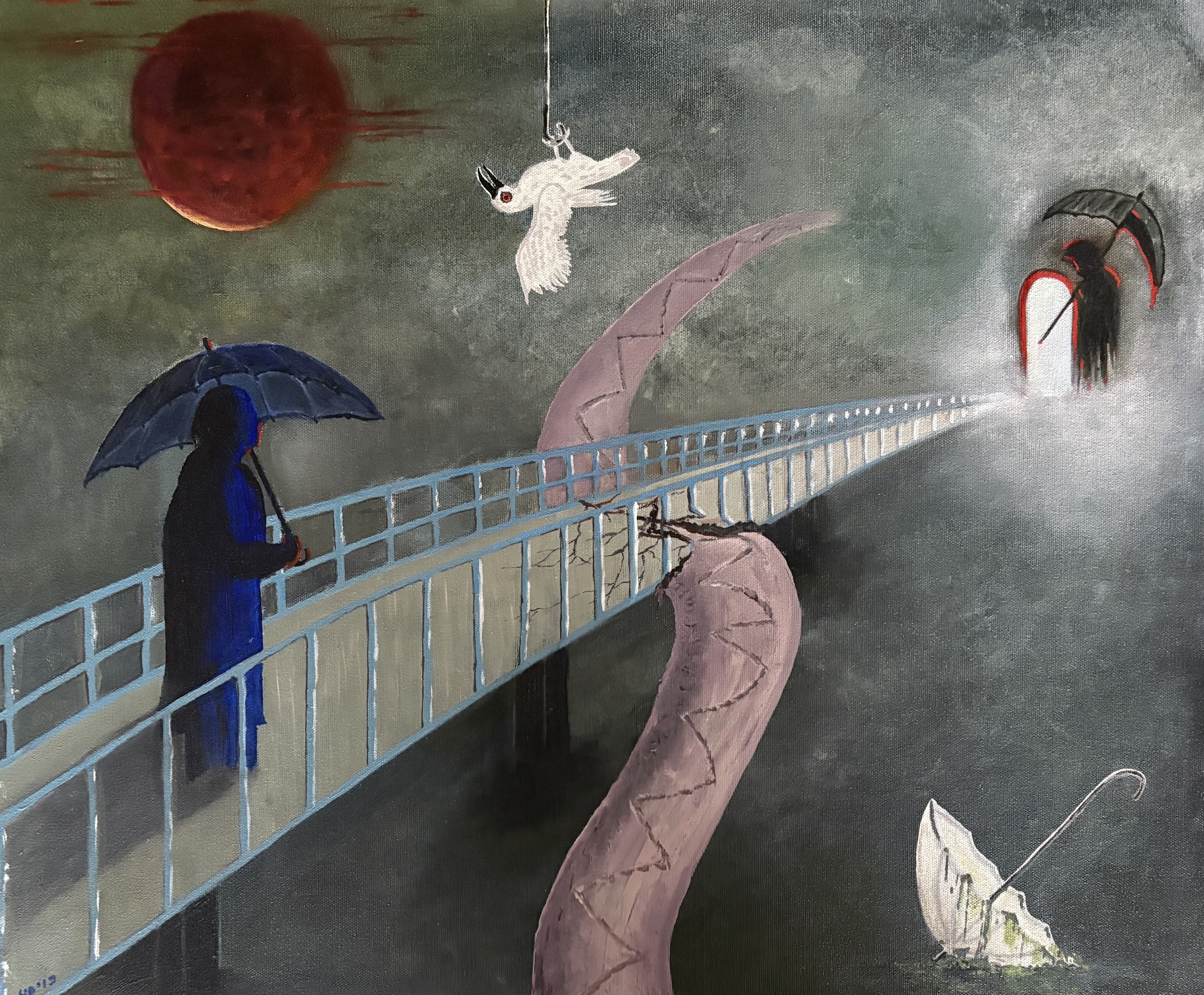 Ik zag een film op TV , een man alleen op een brug, eenzaam. Waar ging de man heen, waar kwam hij vandaan, vluchtend voor zijn demonen op weg naar een andere angst? Die vragen intrigeerden me en zetten me aan om dit aparte werk te maken.