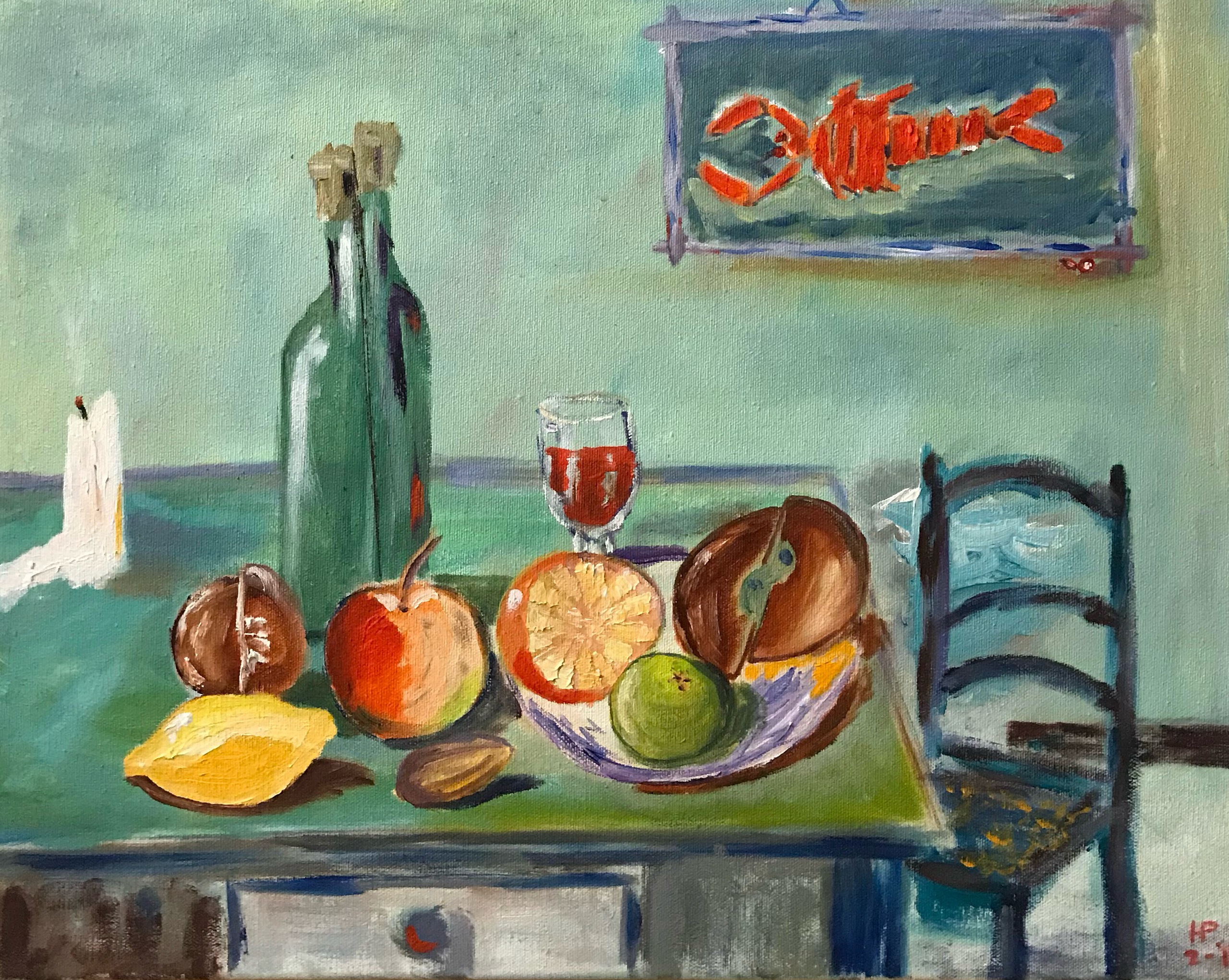 Figuratief Fruit Stoel Van Realistisch In Stilleven Fles Wijn De Tafel Keuken Kreeft Stijl Georges Braque