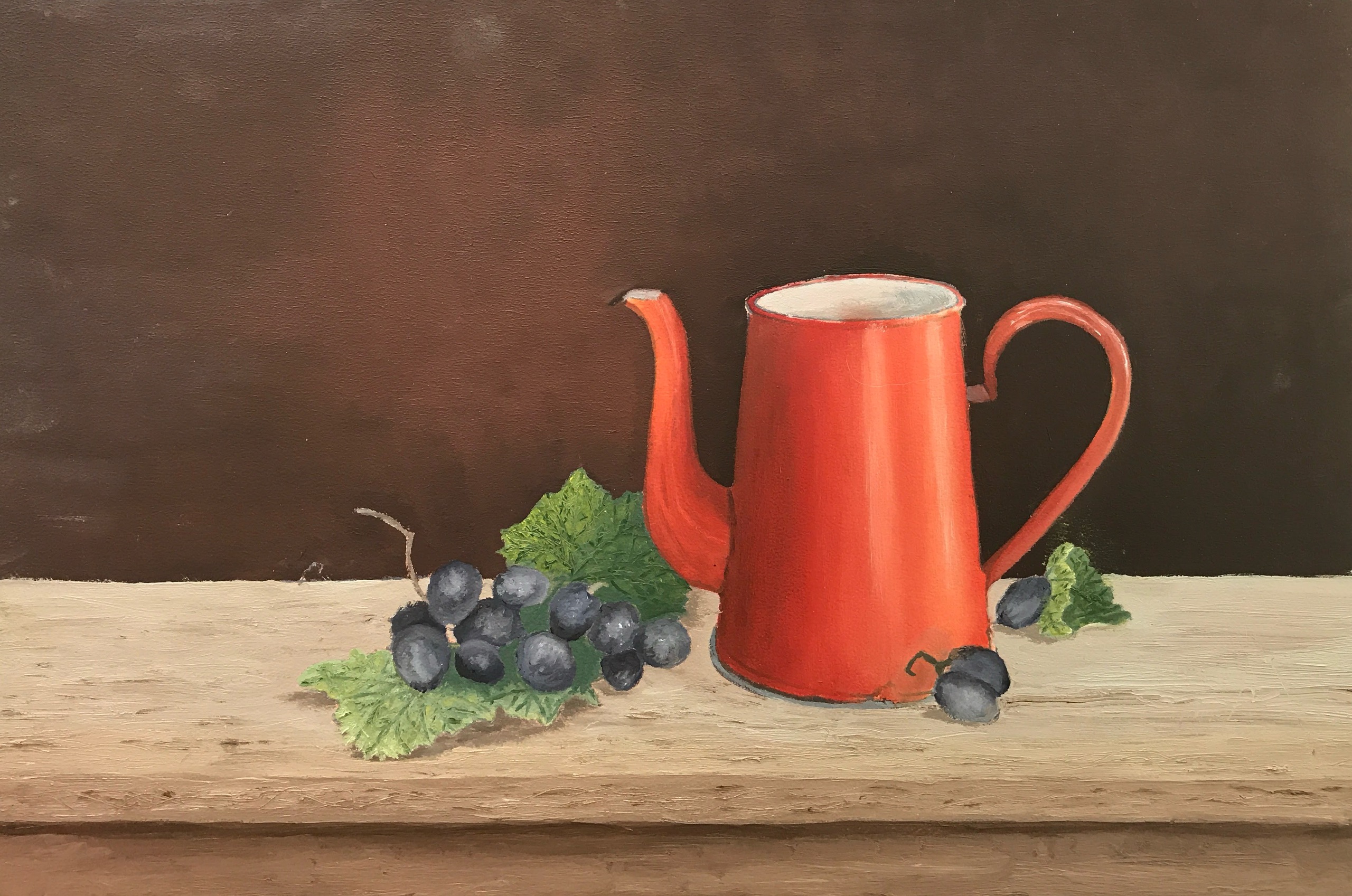 Figuratief Rood Pot Realistisch Olieverf Stilleven Koffiepot Kan Druiven Emaille Druivenblad