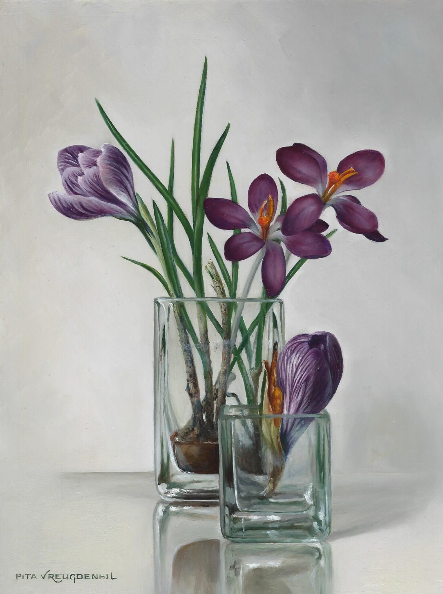 Stilleven Realisme Realistish Olieverf Paneel Bloem Krokus Paars Gebroken Glas Kubus Ingelijst Wit Licht