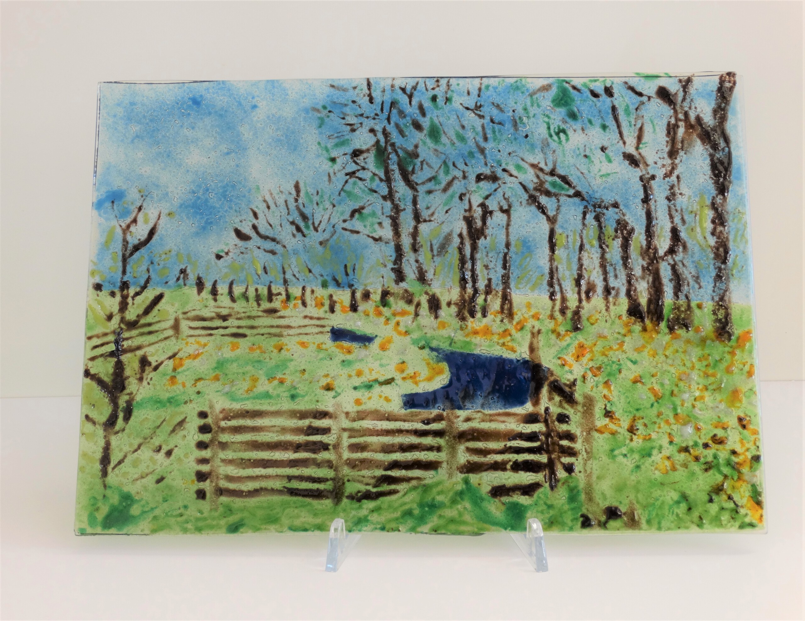 In het kader van de oproep van het Purmerends Museum om mee te doen aan een expositie over het landschap in Waterland en Beemster, heb ik dit tweede glasobject gemaakt van een plek vlakbij mijn huis in het Groengebied Purmerland waar ik regelmatig voorbij kom als ik even ga wandelen. Hier tijdens het voorjaar terwijl het zwarte mosterdzaad en duizendblad bloeit. Het kunstwerk is toegelaten en wasvan 9 oktober 2021 t/m 4 februari 2022 te zien in het Purmerends Museum.