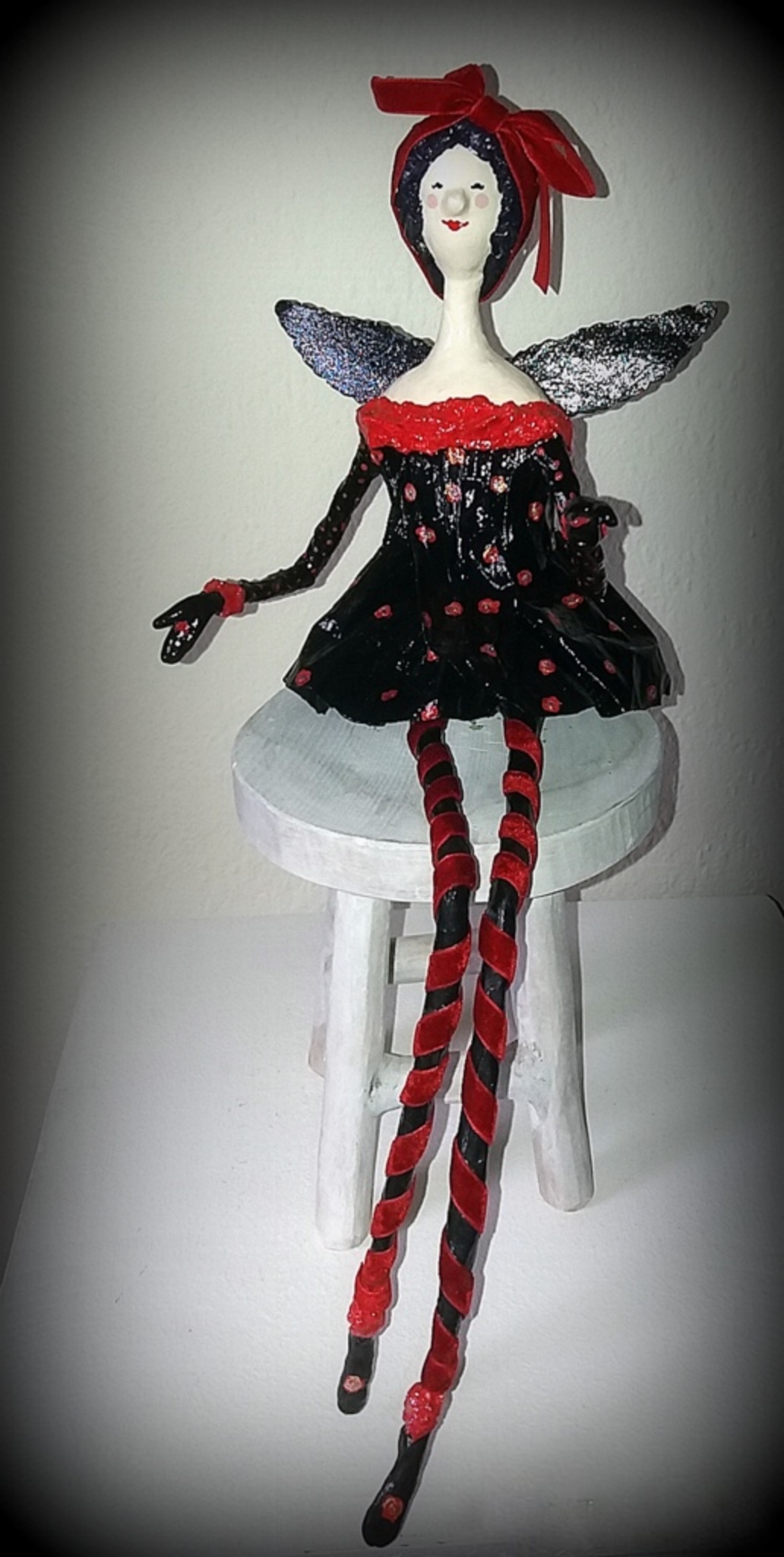 Haar jurkje is geschilderd, de beenmode en het haarstrikje is van rood fluweel. De Happy Angels hebben een zithoogte van ongeveer 20 tot 25 cm ( excl. de beentjes) met een totale lengte van ca. 50 cm. SOLD