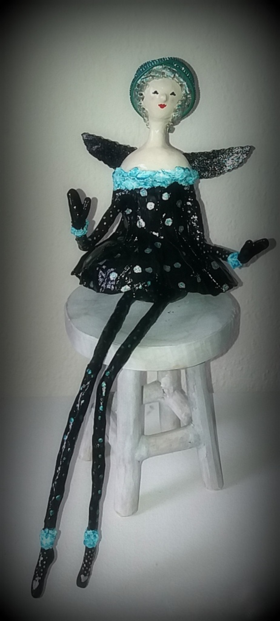 Haar haarband is van blauwe rijsteentjes. De Happy Angels hebben een zithoogte van ongeveer 20 tot 25 cm ( excl. de beentjes) met een totale lengte van ca. 50 cm. SOLD