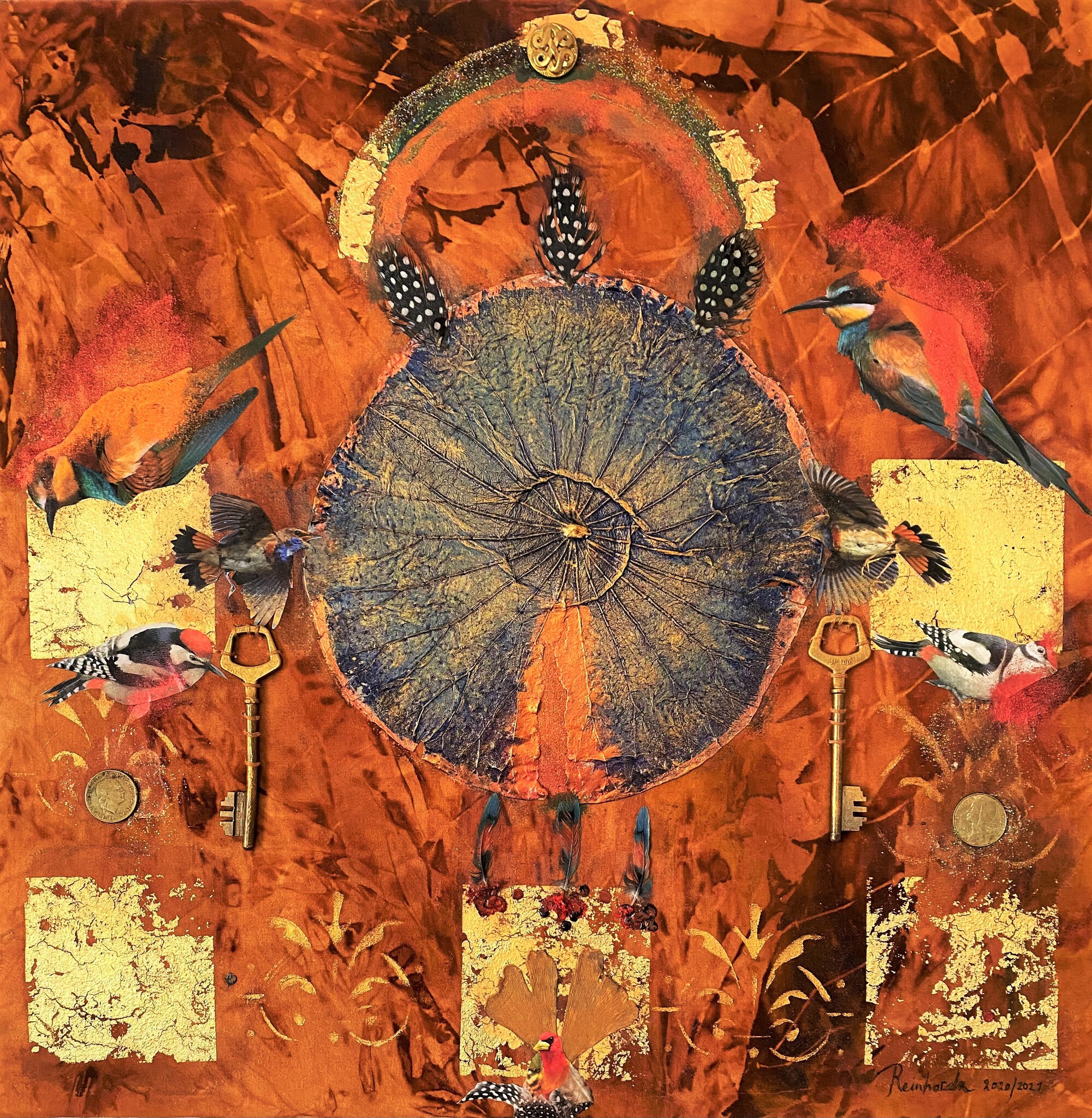 De ondergrond is textiel op canvas, het resultaat van roest-printing.Het bladgoud vertegenwoordigt licht en energie. Ze combineert de spirituele en fantasiewerelden met symbolen, zoals sleutels, gingko-bladeren, veren en vogel afbeeldingen.