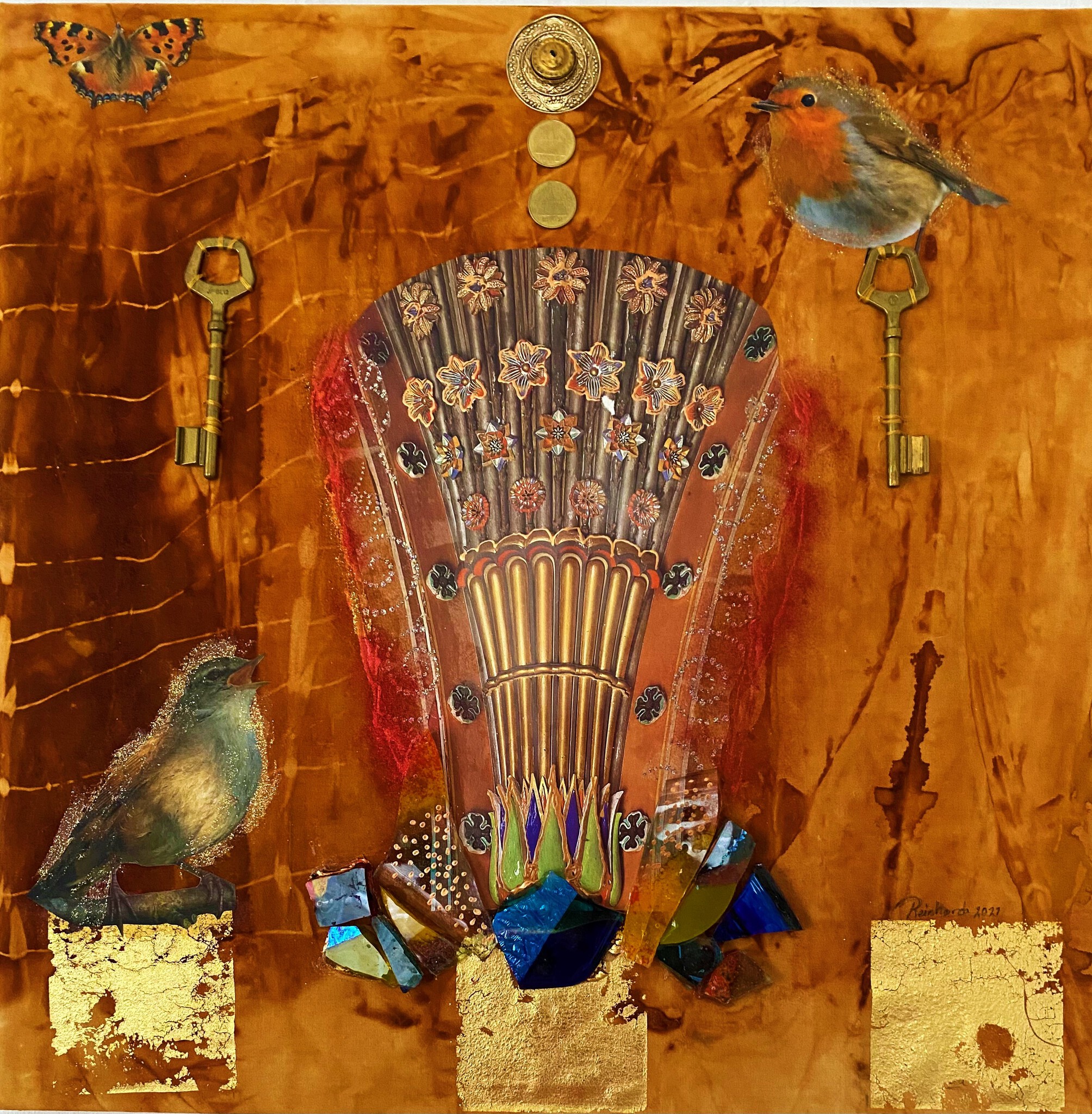 Het bladgoud vertegenwoordigt licht en energie. Ze combineert de spirituele en fantasiewerelden met symbolen, zoals sleutels, gingko-bladeren, veren en vogel afbeeldingen. Origineel zijn de verwerking van stukjes glas .