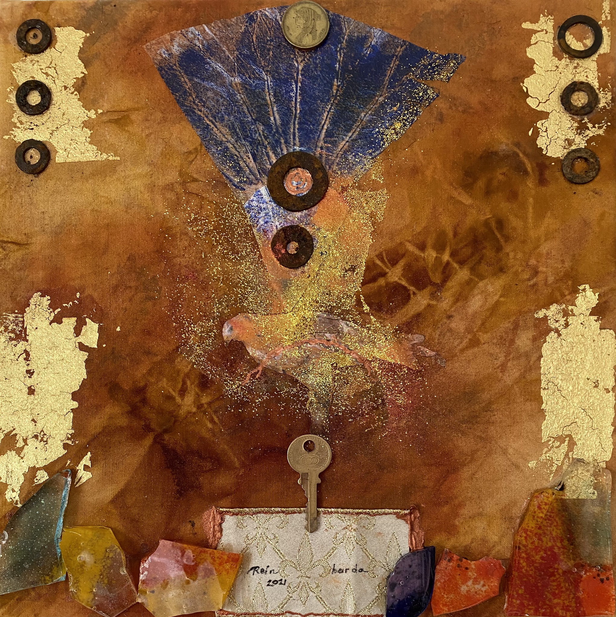 Het bladgoud vertegenwoordigt licht of spirituele energie. Ze combineert de spirituele en fantasiewerelden met symbolen, zoals sleutels, gingko-bladeren, veren en vogel afbeeldingen. Origineel zijn de verwerking van stukjes glas .