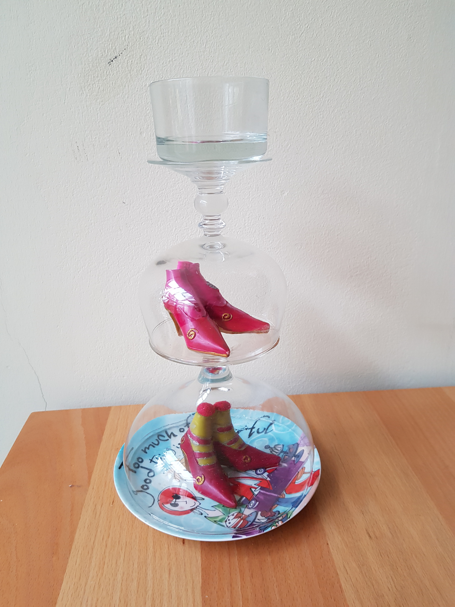 Ik was als kind helemaal dol op het sprookje van De Rode Schoentjes in de Efteling. Die heb ik nu vastgelegd in deze kaarsenstandaard, in combinatie met een vrolijk gebaksbordje.