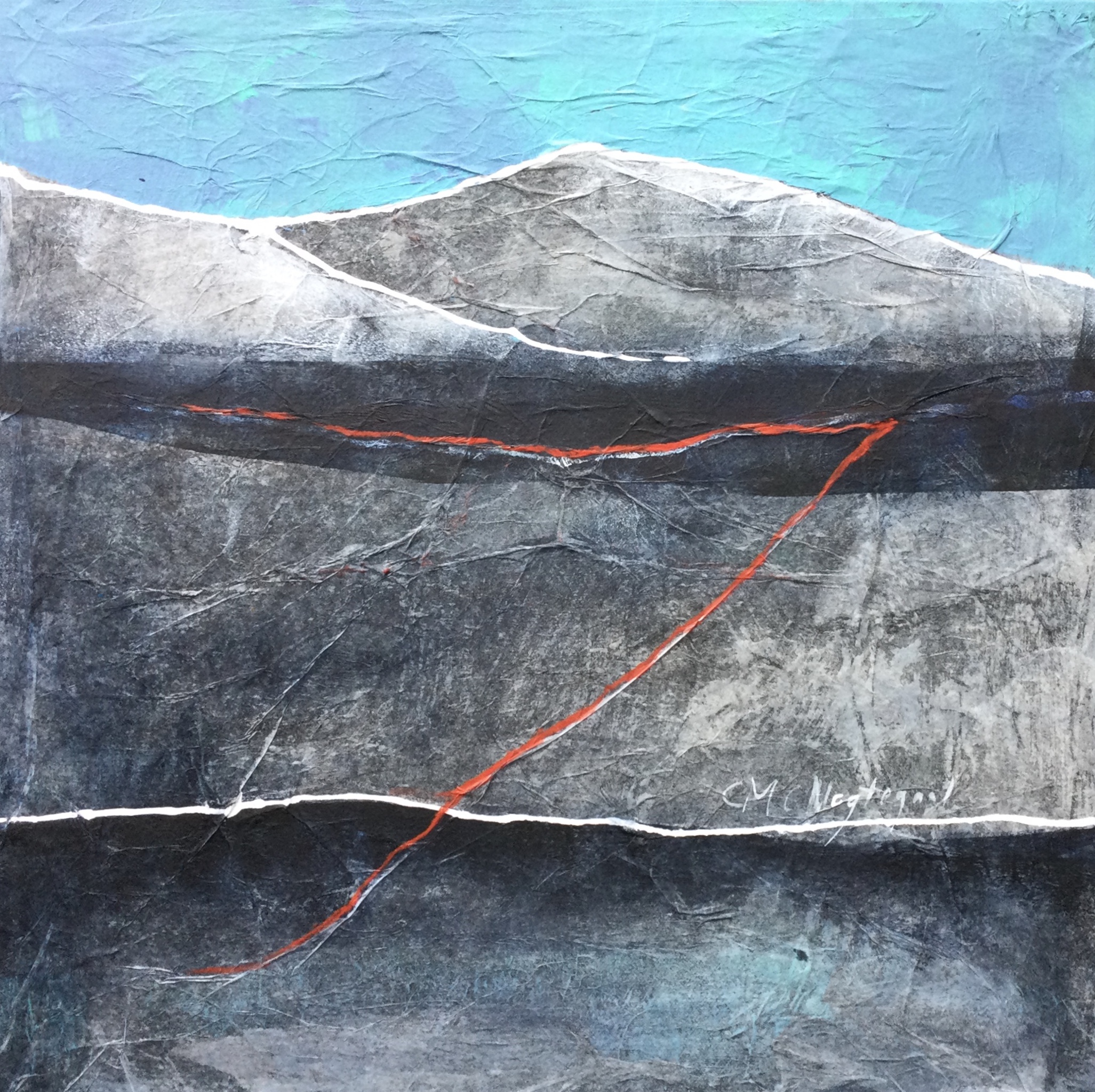 Een klein schilderij wat onderdeel is van tweeluik over de bergen .De kleuren zijn gedempt ,blauwgrijs met zwart en wat rood.De structuren spelen de belangrijkste rol.
