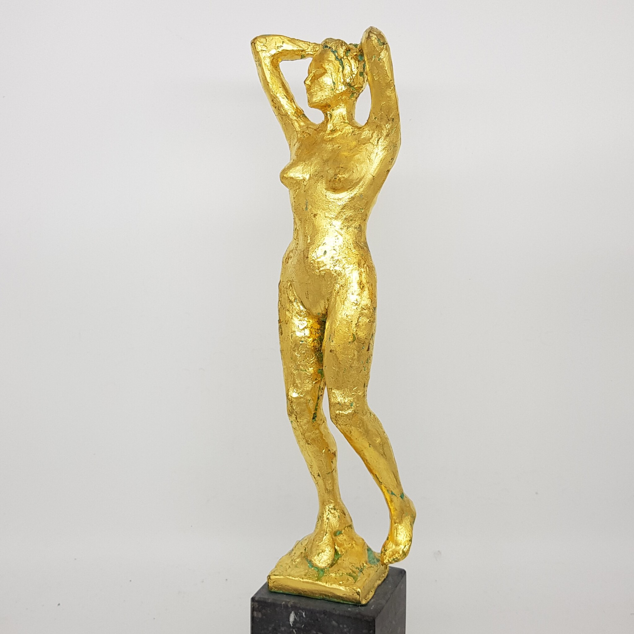 Nimf Brons met bladgoud. Inclusief hardstenen sokkel