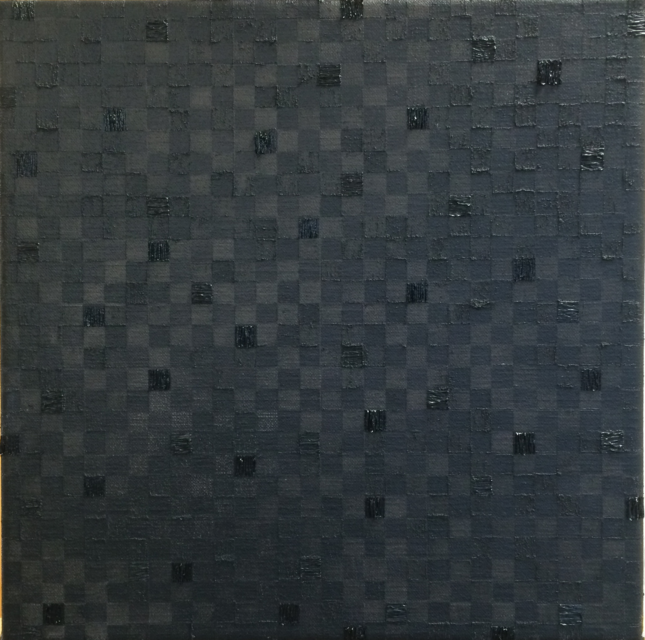 Thema: Chaos (Geometrische Chaos) Mijn kunst is beïnvloedt door de moderne wiskundige en wetenschappelijke benadering van het begrip complexe orde van de natuur. Met name heb ik me verdiept in de Chaos theorie en de fractal geometrie. Ik ben geen wiskundige, en ik gebruik geen wiskundige formules. De ideeën van de Chaos theorie en fractal geometrie leiden tot de ontwikkeling van de composities in mijn werk. Ik gebruik driehoeken,vierkanten en cirkels in mijn schilderijen, maar in mijn huidige serie, geoChao richt ik me alleen op de vierkanten en de verhoudingen tussen de vierkanten. Ik ontwikkel mijn composities door kleine vierkantjes op grote te zetten of grote op kleine te zetten. Het gaat om de onderlinge verhoudingen tussen de vierkanten. Ik laat de methode die ik kies de compositi