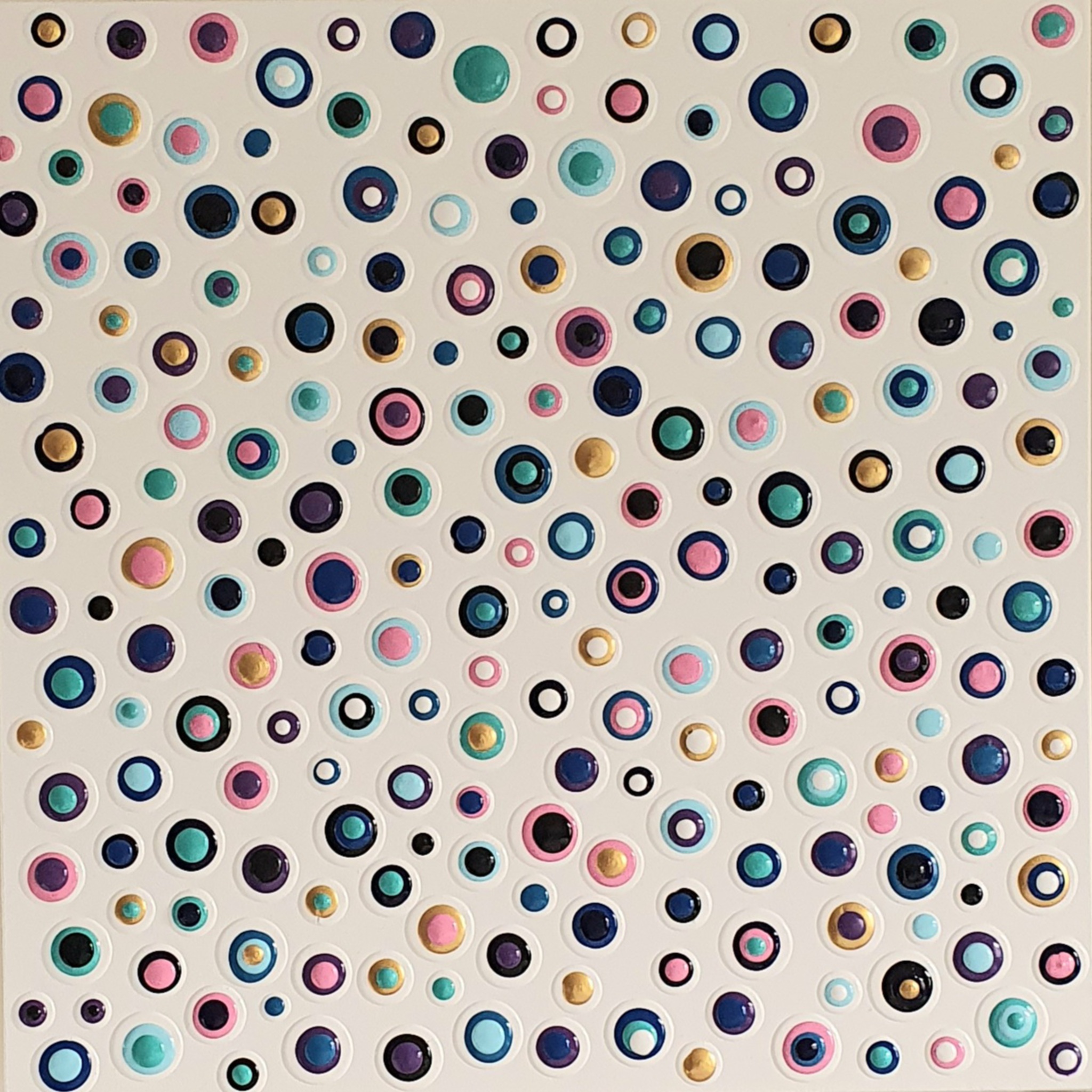 Schilderij met dots, blobs in diverse frisse kleuren op een witte achtergrond. Dit alles in een mooie 3D lijst. Doordat de blobs op het schilderij liggen, krijg je een heel mooi 3D effect. Afgewerkt met een hoogglans vernislaag. Formaat canvas is 50x50x4 cm. Inclusief lijst is het 60 x 60 x 5 cm. Rechtstreeks van de kunstenaar, koper is de eerste eigenaar. Handgesigneerd. Als het schilderij verstuurd moet worden, dan wordt het goed verpakt in bubbeltjesplastic, piepschuim platen en een kartonnen doos.