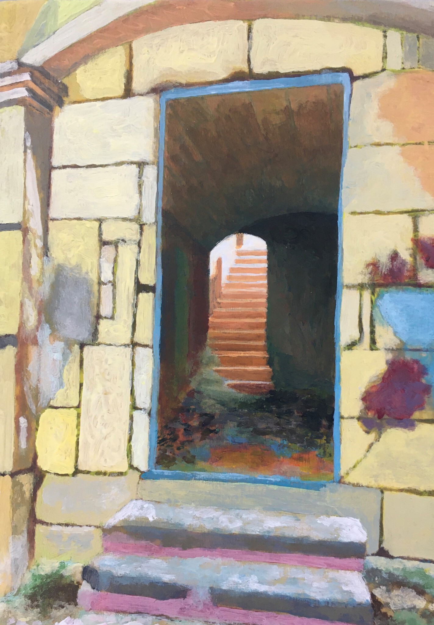 Paneeltje met als onderwerp de opgang van een vervallen villa op Mallorca.