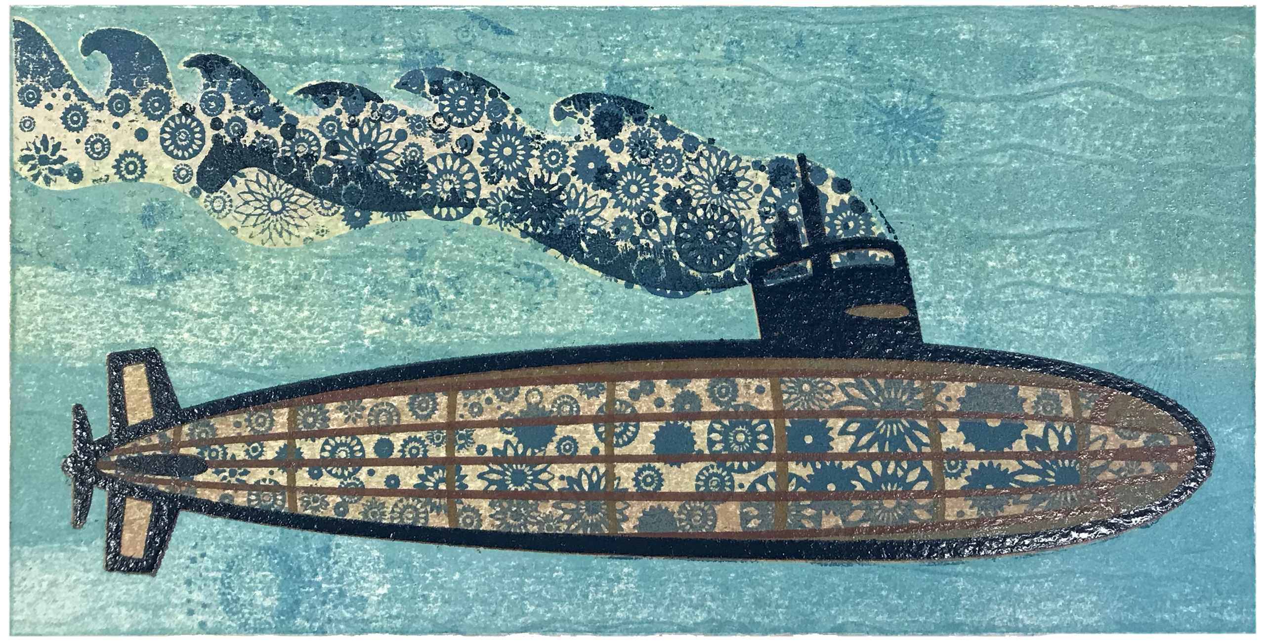 Een serie mini hoogdrukprenten rond het thema tulpen. Deze onderzeeboot brengt de lente vanuit zee. Een soort geboorte van Venus, maar dan anders....
