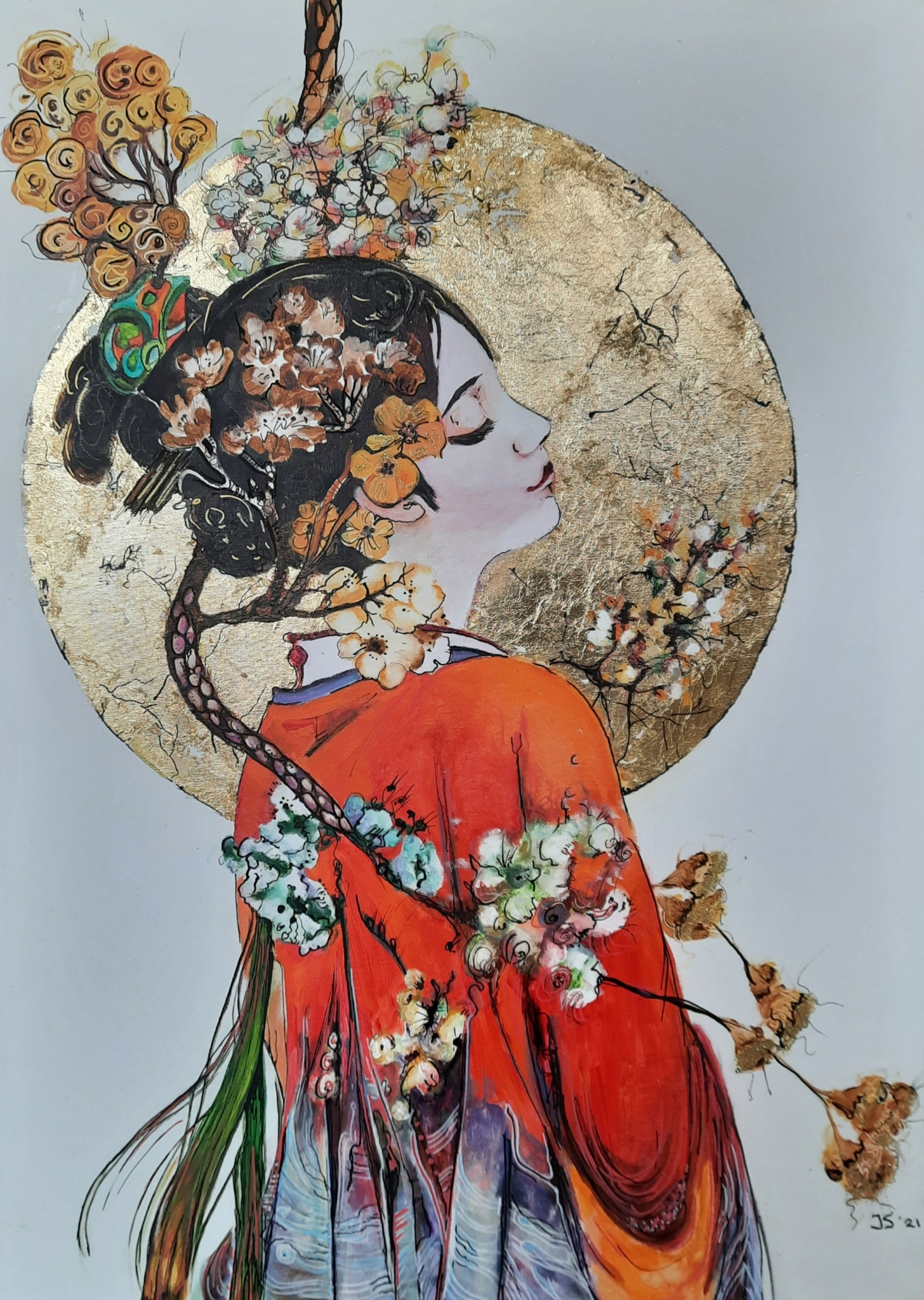 Mixed media werk, uitgevoerd met bladgoud, oostindische inkt en acrylverf en embossing poeder. De foto is eerst met de deepdream generator bewerkt . Dit werk is als print, in vele soorten en maten, te bestellen op werkaandemuur.nl