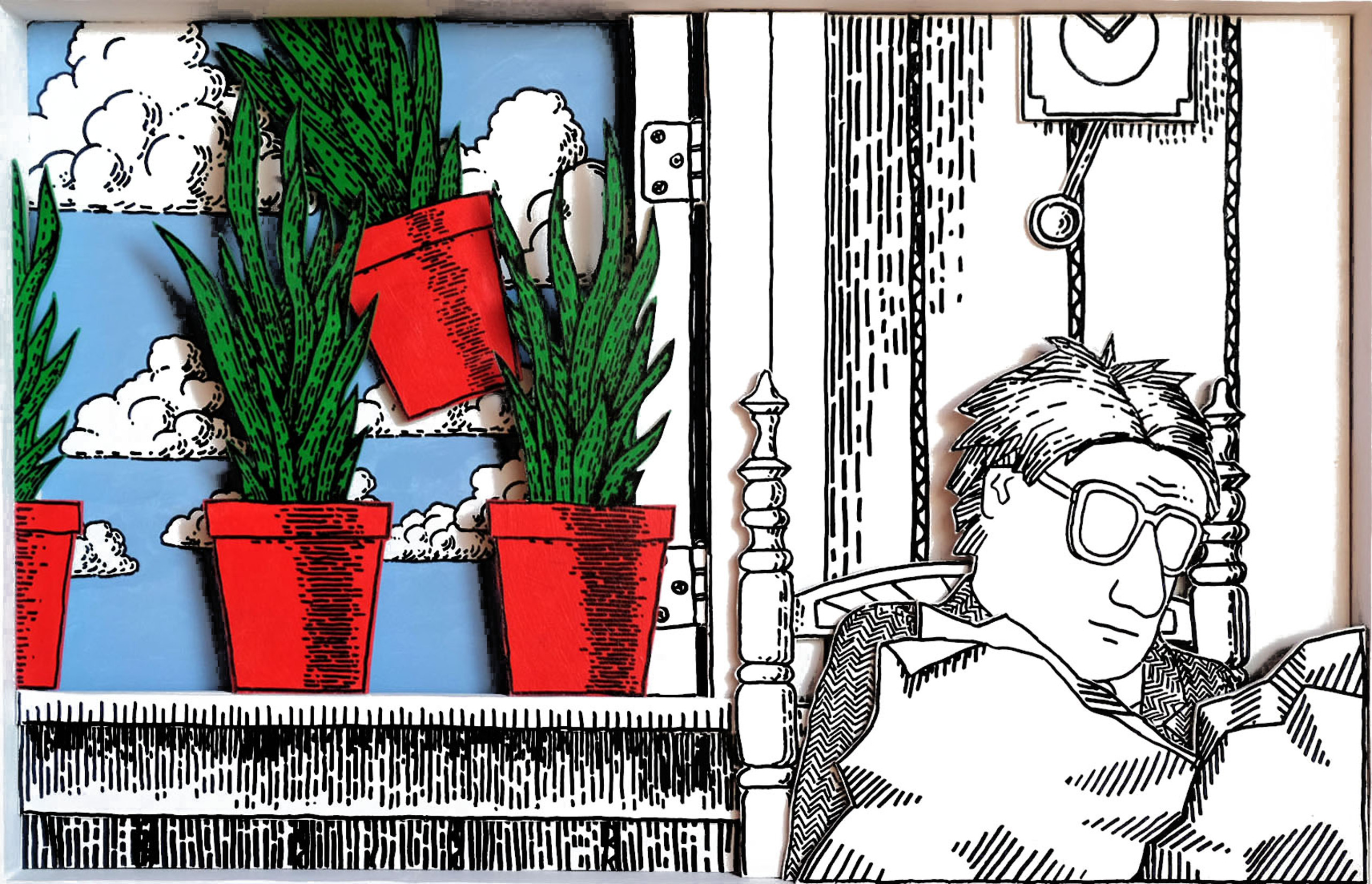 Dit is de tweede prent van de sanseveria-valbeweging. Dit is het verhaal van de één na bovenste verdieping. Het kan natuurlijk een kleine wolkenkrabber betreffen waar de sanseveria naar beneden tuimelt, dan heb ik nog een aantal schilderijen te gaan.