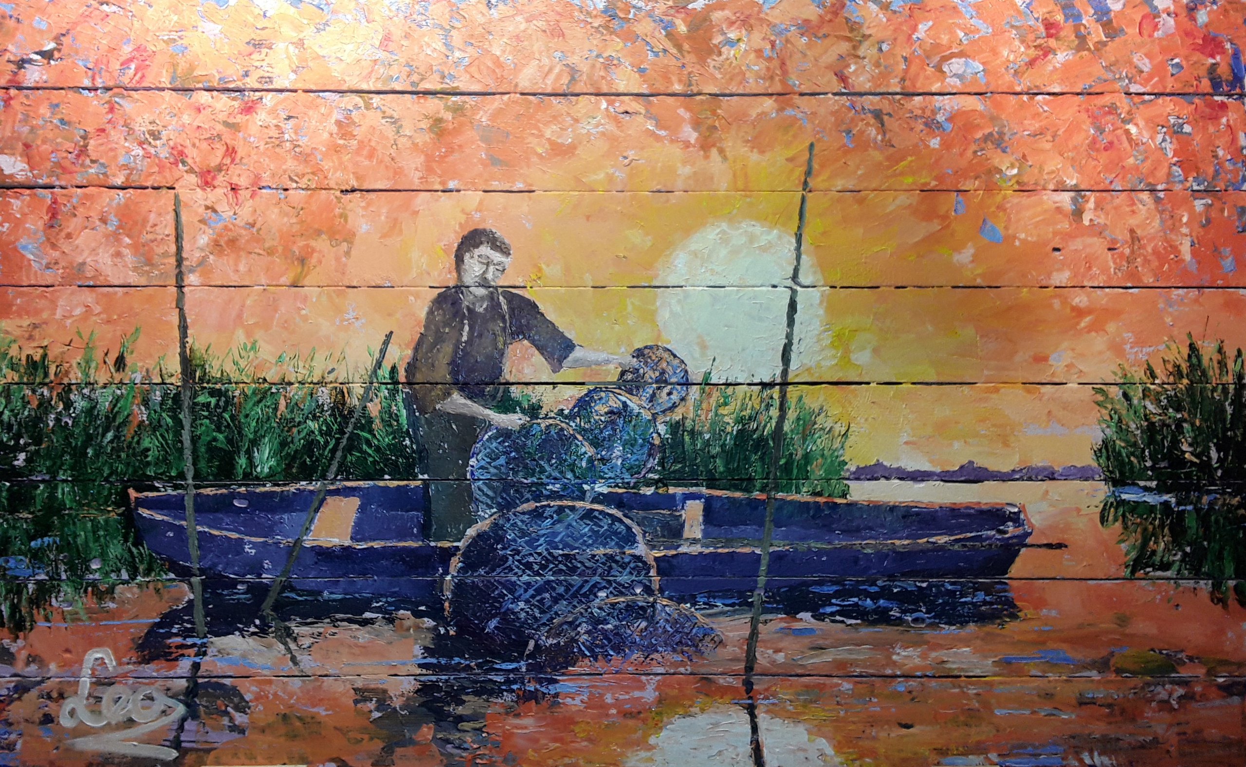 Dit werk toont een Palingvisser die zijn fuik leegt op de Nieuwkoopse Plas.