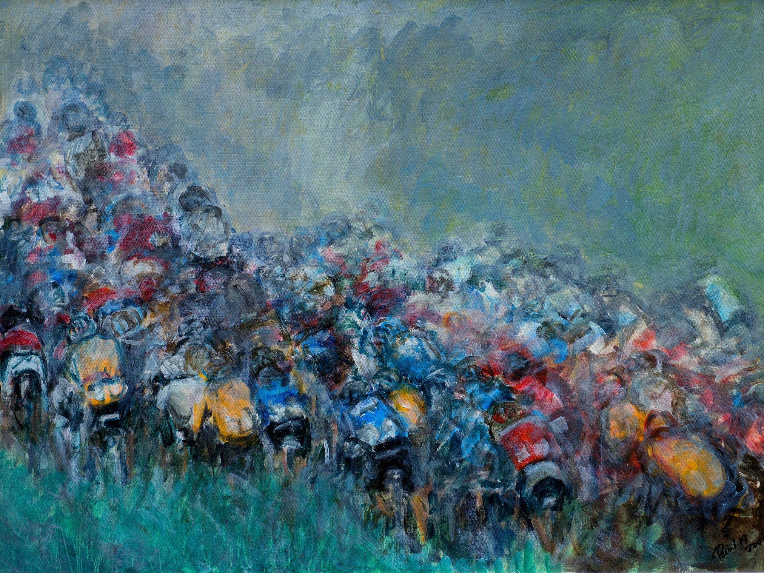Wielrenners in de Tour de France beginnen aan een bergetappe. Weergegeven door chaotische lijnen en kleuren. VERKRIJGBAAR als kunstkaart en giclée, fine art.
