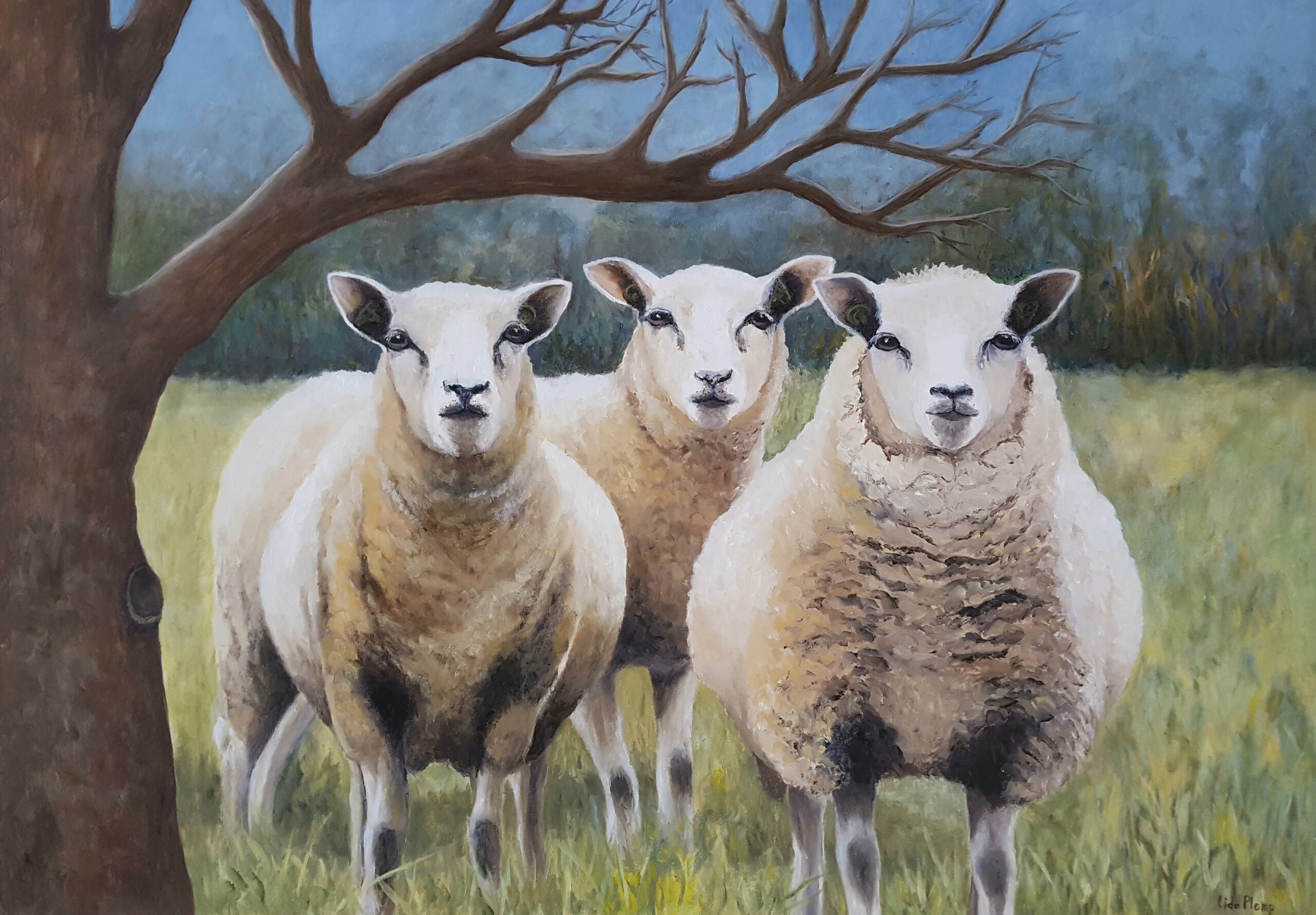 Nieuwsgierige schapen. Olieverf schilderij