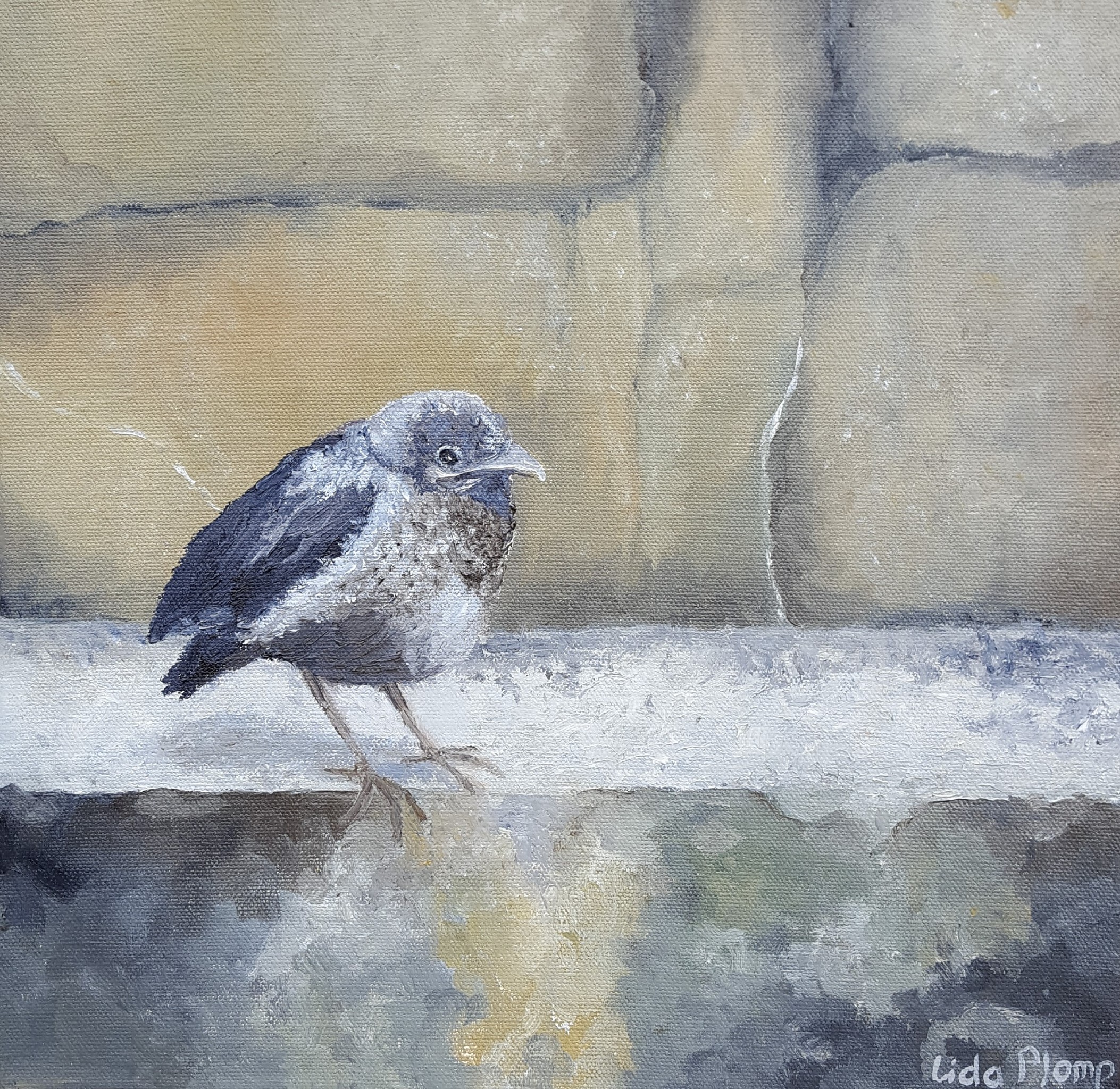 Jonge merel net uit het nest. Olieverf.