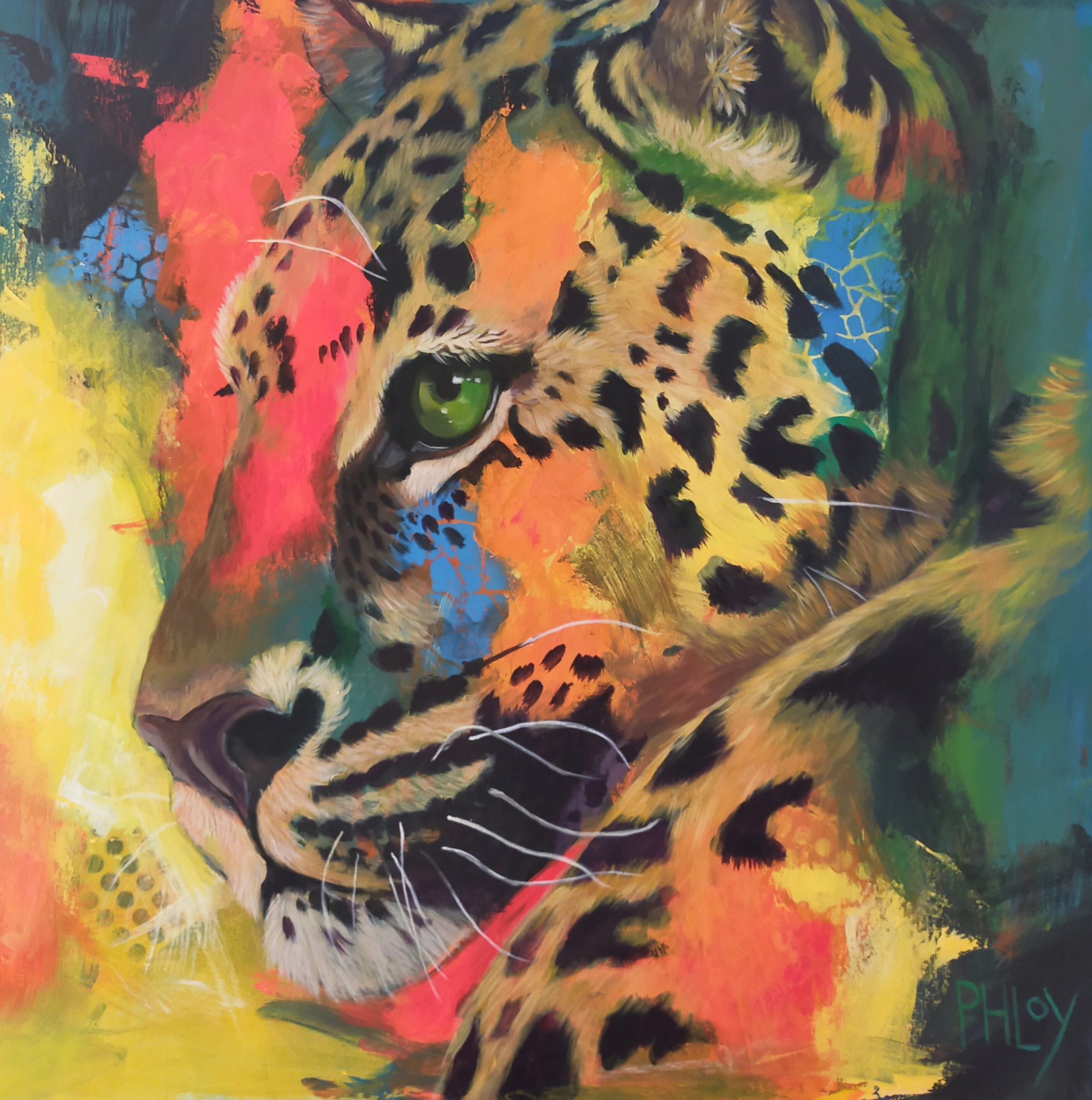 De kleuren en vormen van dit abstracte schilderij nodigden me uit om dit indrukwekkende luipaard te schilderen. Door gedeeltes van de kop weg te laten onstaat er een interactie met de abstracte achtergrond. Ik heb acrylverf, spraypaint ,sjablonen en acryl markers en gebruikt De foto is van de site wildlife reference photo. for the artist