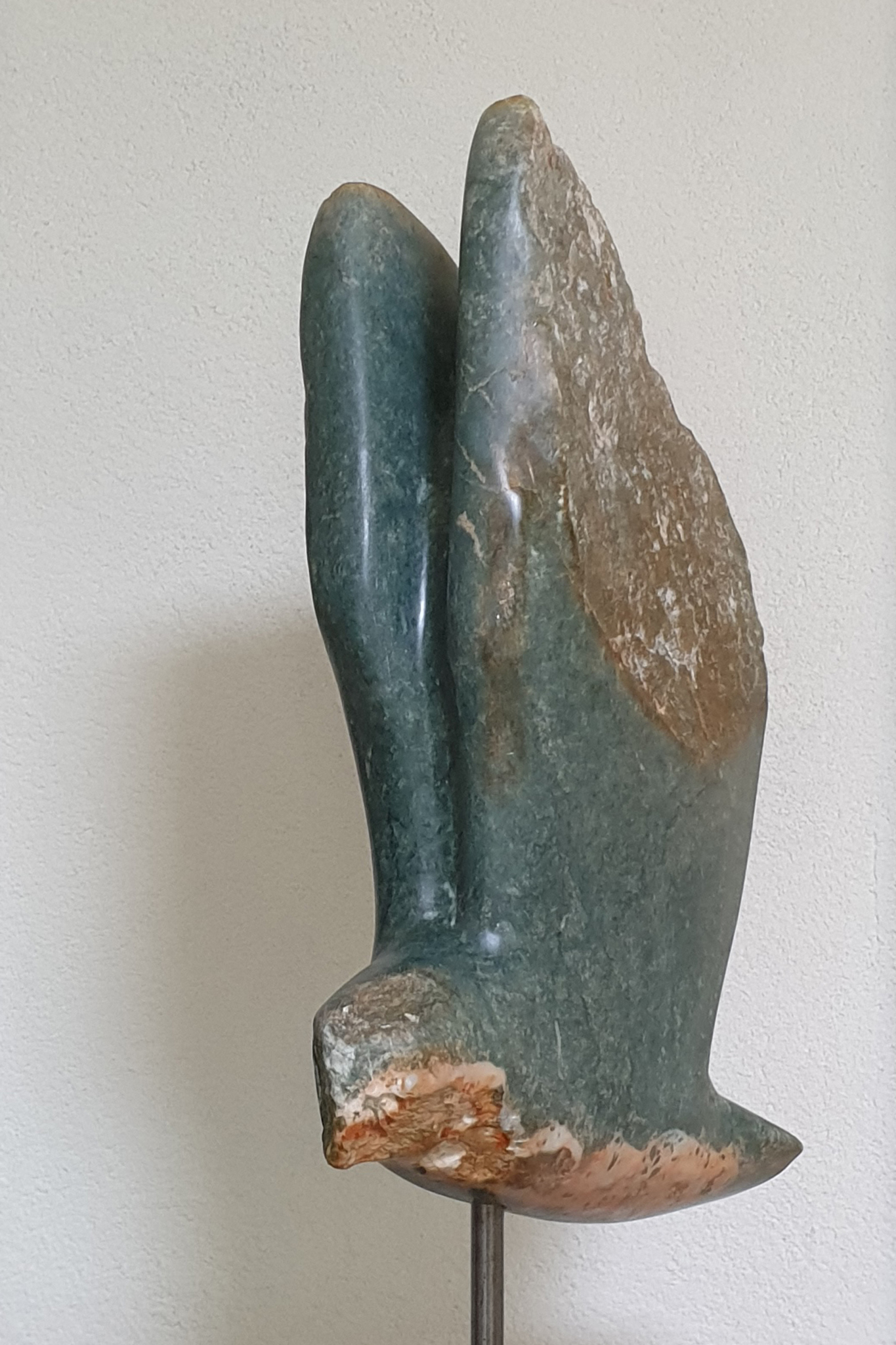 Vliegend, een vogel van serpentijn met de vleugels omhoog. De ruwe buitenkant van de steen is zoveel mogelijk behouden en geeft een mooi contrast met de bewerkte gladde binnenkant.