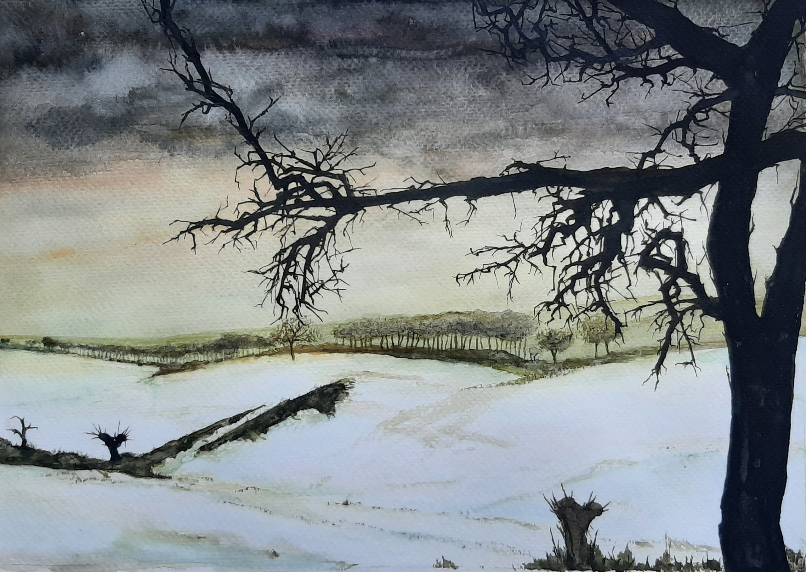 In de winter van 2020-2021 begon ik aan een aantal aquarellen in winterse sfeer. Naast de bizons in Yellowstone (een reeks van 6 aquarellen) maakte ik tegelijkertijd een aantal aquarellen in de geest van de Belgische landschapsschilder Valerius de Saedeleer (1867-1941), een van de belangrijkste vertegenwoordigers van de zogenaamde Latemse School. Ook de Saedeleer schilderde een aantal prachtige winterlandschappen. Het aquarel is gemaakt op 300grams Talens/vanGogh papier, afmetingen 30x40 De vermelde prijs is exclusief passe-partout en/of lijst