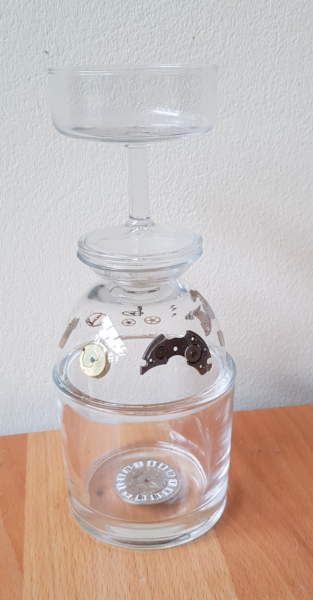 Een horloge dat helemaal uit elkaar gehaald is. De onderdelen vinden elkaar terug in deze standaard.