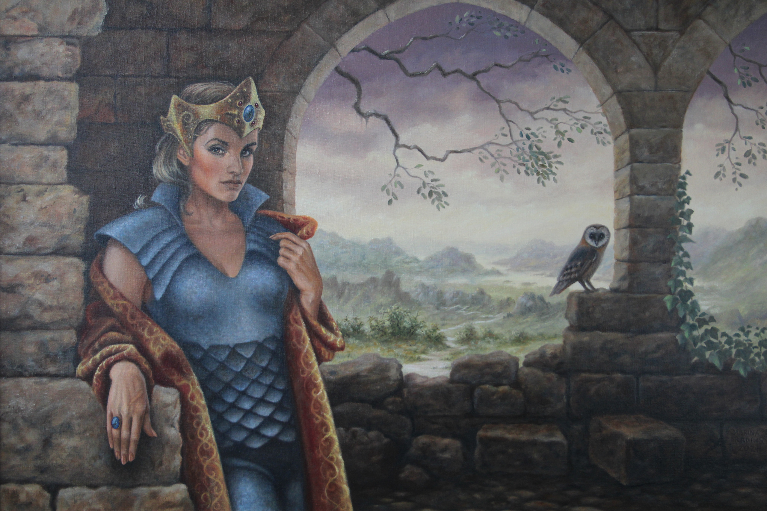 Geïnspireerd door oude kerk-en kasteelruïnes maakte ik dit schilderij; het uiltje symboliseert de wijsheid.