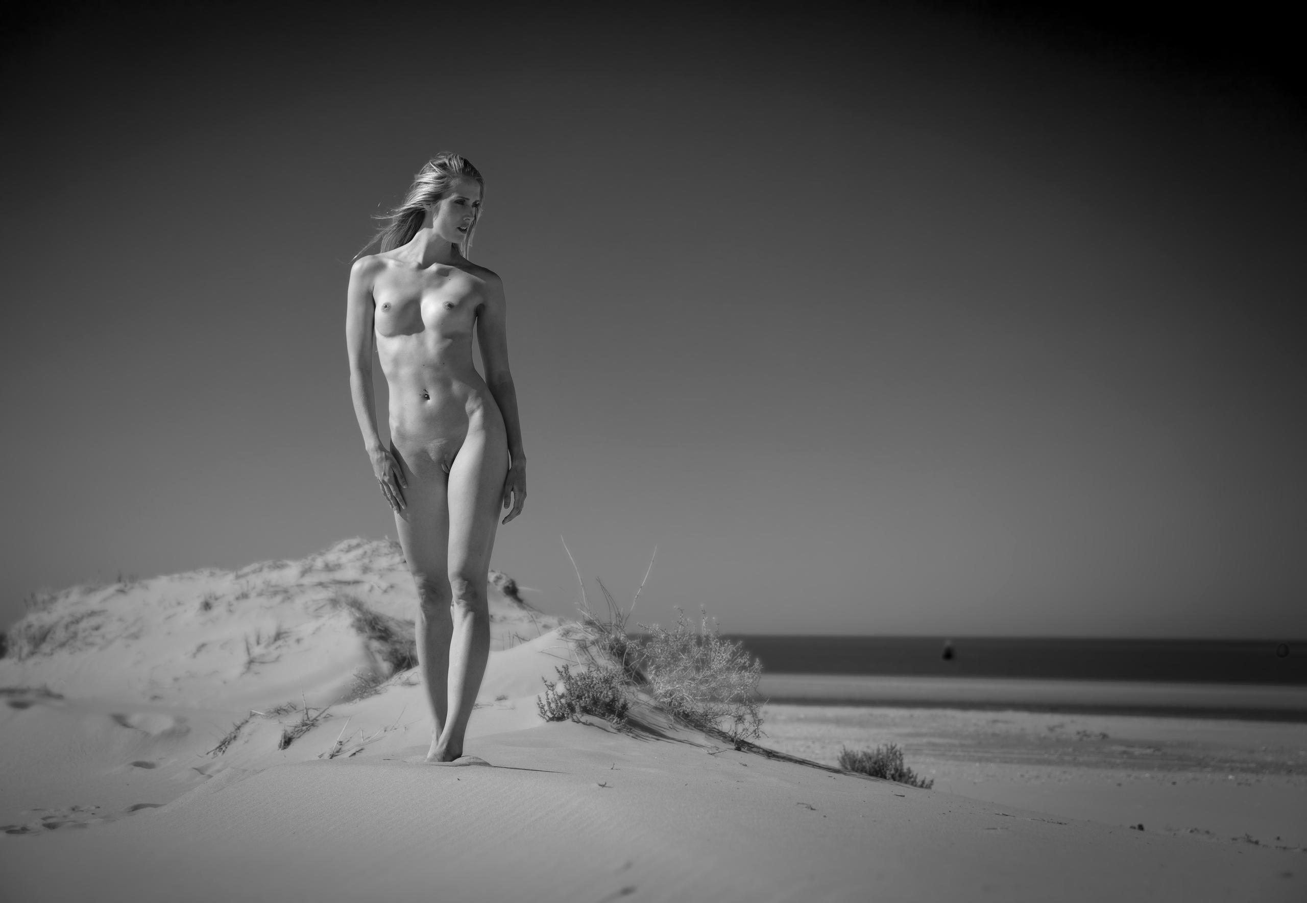BnW opname van model Wendy op het strand van Ouddorp - augustus 2019 - fine art paper op dibond