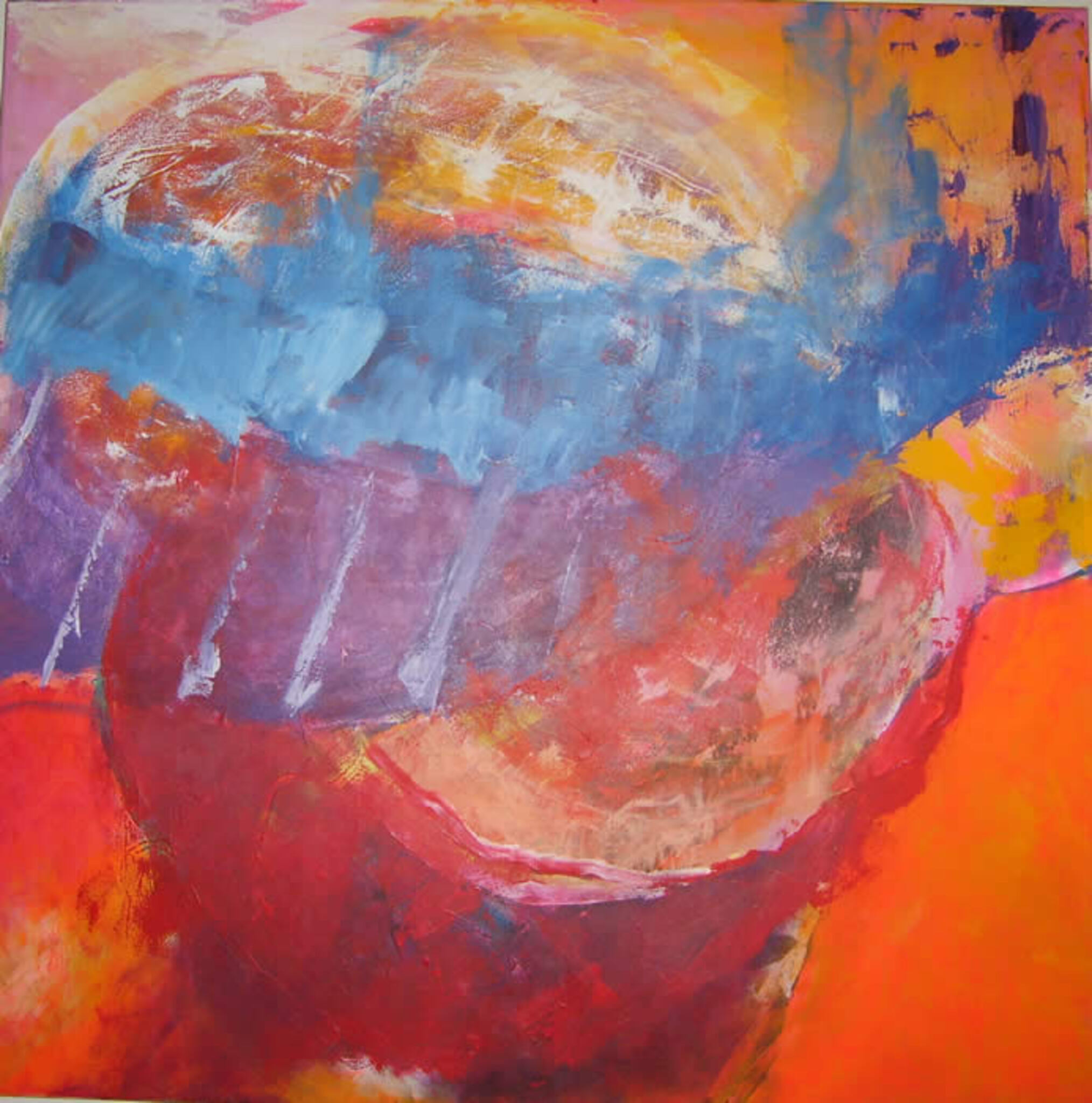 Werk in acryl en olie. Krachtige stijl, kleurrijk, uitbundig. Op de grens tussen non-figuratief en herkenbare vormen.